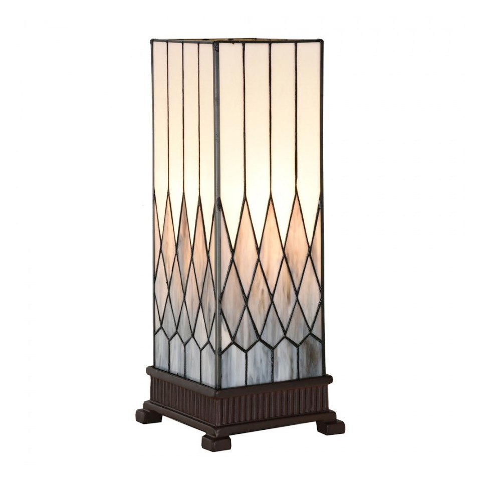 Ta lampa Tiffany witrażowa przybiera formę eleganckiego słupka, który wydaje się wznosić w górę, w nieznane przestrzenie designu. Wyrazisty kontrast pomiędzy metalicznym brązem, stonowaną bielą, a subtelnymi odcieniami szarości sprawiają, że lampa staje się punktem centralnym każdego wnętrza. To jak obraz w ruchu, od którego nie możesz oderwać wzroku.