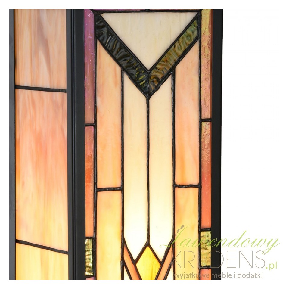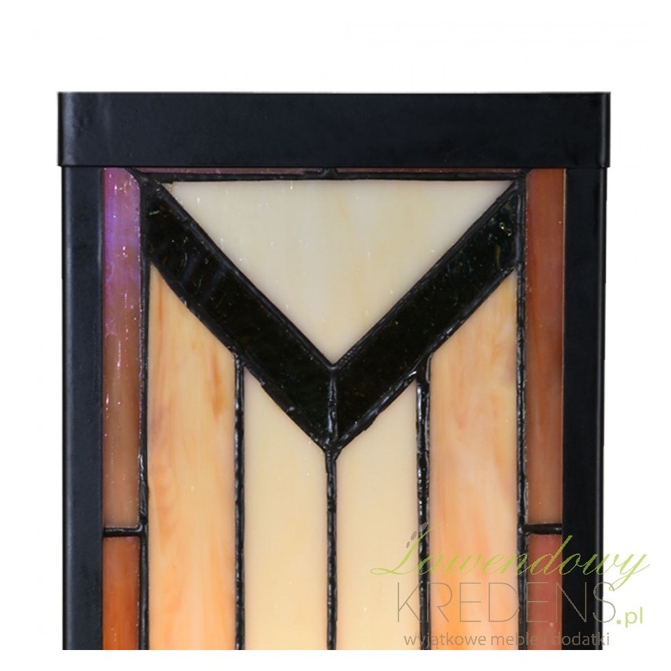 Model Słupek R wyróżnia się elegancką, pionową formą, która sprawia, że doskonale prezentuje się zarówno na konsoli, jak i na stoliku nocnym czy komodzie. Smukła podstawa w ciemnym wykończeniu kontrastuje z bogato zdobionym kloszem, tworząc spójną i wyrafinowaną całość. Po zapaleniu światła, barwione szkło rozświetla przestrzeń miękkim, przytulnym blaskiem, który buduje atmosferę spokoju i relaksu.