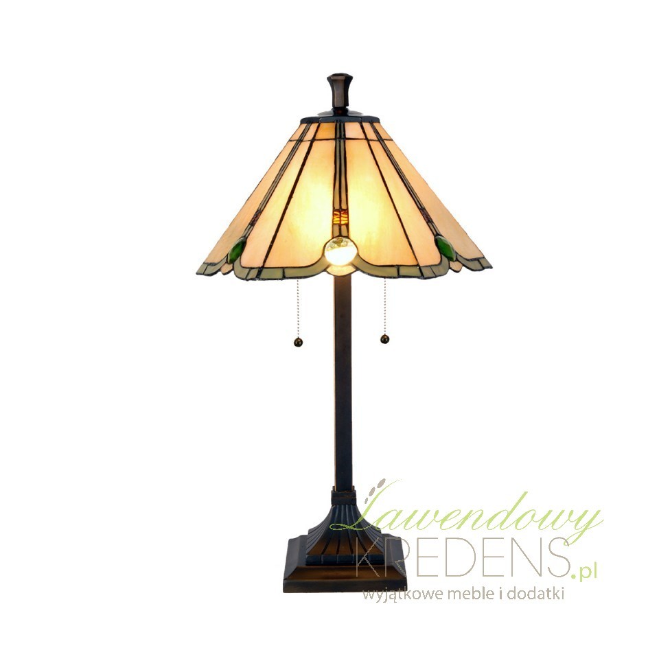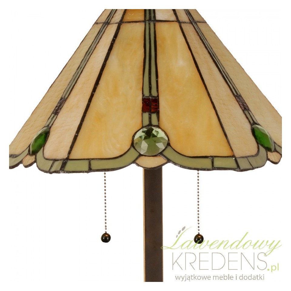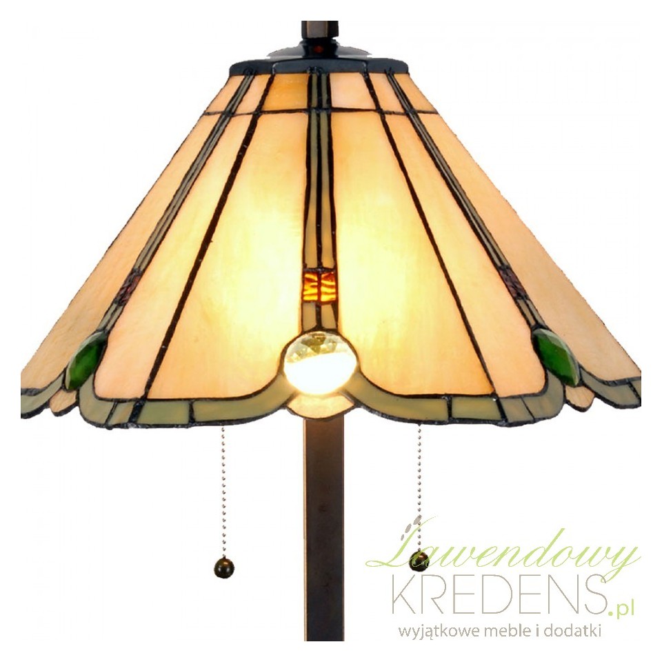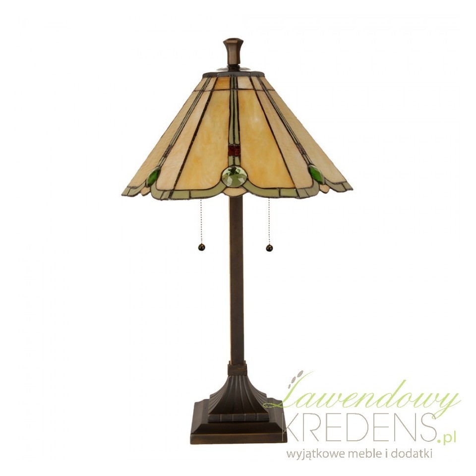 Lampa stołowa Tiffany K Clayre & Eef to ręcznie wykonane dzieło sztuki ze szkła i żywicy. Jej witrażowy klosz w odcieniach kremu i zieleni tworzy nastrojowe światło, idealne do salonu, sypialni czy gabinetu. Doskonała do wnętrz vintage, prowansalskich i art déco, pięknie komponuje się z innymi lampami Tiffany.