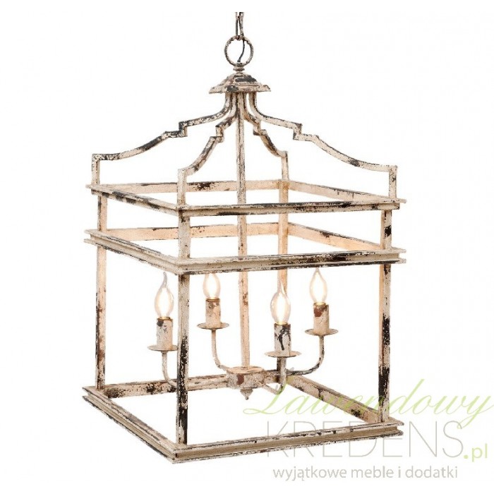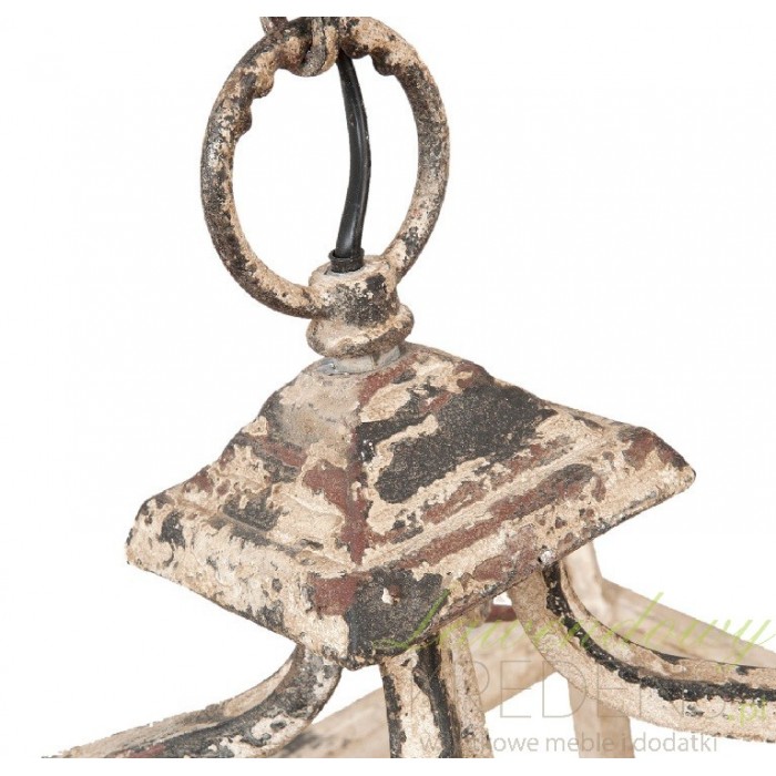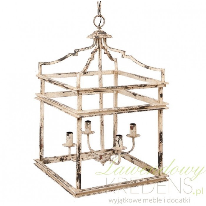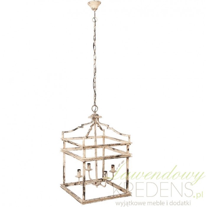 Lampa Metalowa Prowansalska Klatka to wyjątkowy, czteroramienny żyrandol w kremowym kolorze z licznymi przetarciami farby. Podobnie jak sama konstrukcja, tak i łańcuch oraz podsifitka żyrandola wykonane są metalu. Konstrukcja na około samego żyrandola przypomina kształtem klatkę na ptaki. Jeśli więc interesują Cię lampy w stylu prowansalskim o ciekawym i niespotykanym designie, to ten żyrandol powinien spełnić Twoje oczekiwania.
