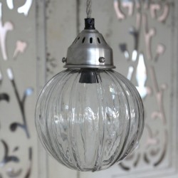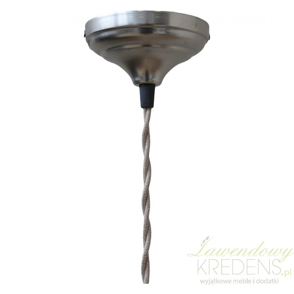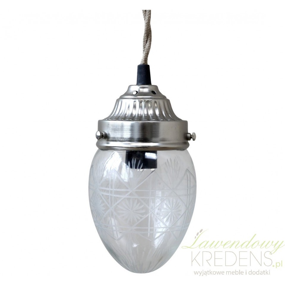 Owalna lampa marki Chic Antique to lampa wykonana ze szkła, która kształtem przypomina spadająca kroplę. Na szklanej powierzchni wykonano delikatne wzorki, które akcentują jej unikatowy styl wykonania. Szklany klosz został połączony z kablem w bawełnianym oplocie za pomocą metalowego elementu w srebrnym kolorze. Lampa prowansalska to stylowy dodatek o nieprzesadzonej konstrukcji.