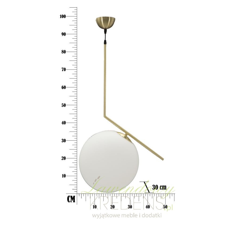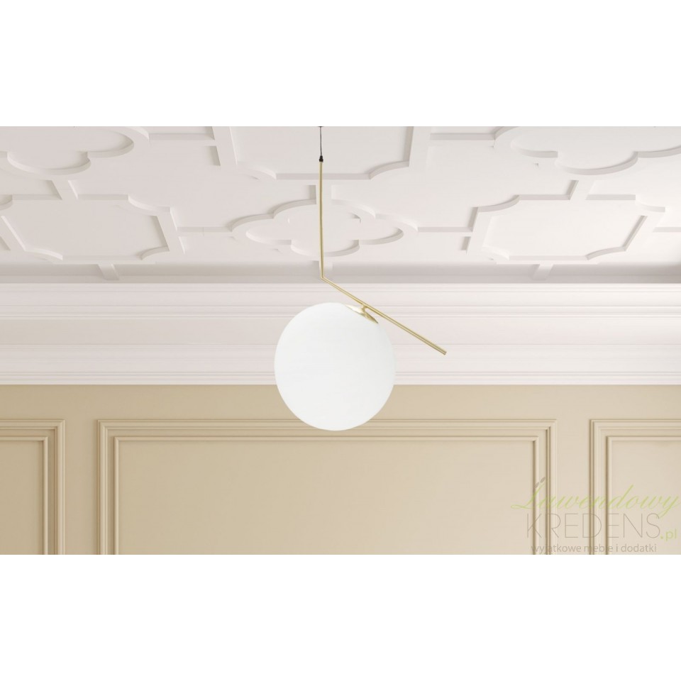 Dedykowane eleganckim aranżacjom elementy oświetlenia wnętrza to między innymi złote lampy z szklanymi kloszami w kształcie dużych kuli. Prezentowana, złota lampa wisząca ze złotą podsufitką ma minimalistyczną formę, która zbliżona jest do kształtu wygiętej litery L. Ten model lampy może tak naprawdę oświetlić każdą przestrzeń, aczkolwiek najlepiej wygląda nad stołem lub stolikiem kawowym. Złote lampy wiszące od Mauro Ferretti świetnie wyglądają zamontowane w rzędzie po kilka elementów obok siebie, w niedużych odstępach.