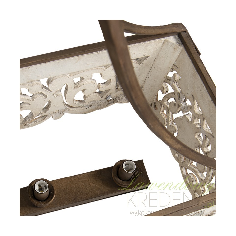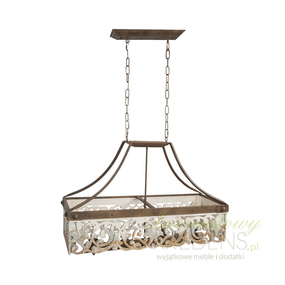 Podłużna lampa w stylu prowansalskim składa się z wielu elementów wykonanych z drewna i metalu. Z metalu powstał łańcuch, stelaż lampy oraz owalny pierścień, który stanowi mocowanie dla drewnianego dekoru. Drewniany dekor to najciekawsza i zdecydowanie najbardziej wyrazista część lampy w stylu prowansalskim. Dekor przykuwa uwagę ze względu na ażurową formę i pokrywające go postarzenia jakimi są rdzawe przebarwienia na białym tle.