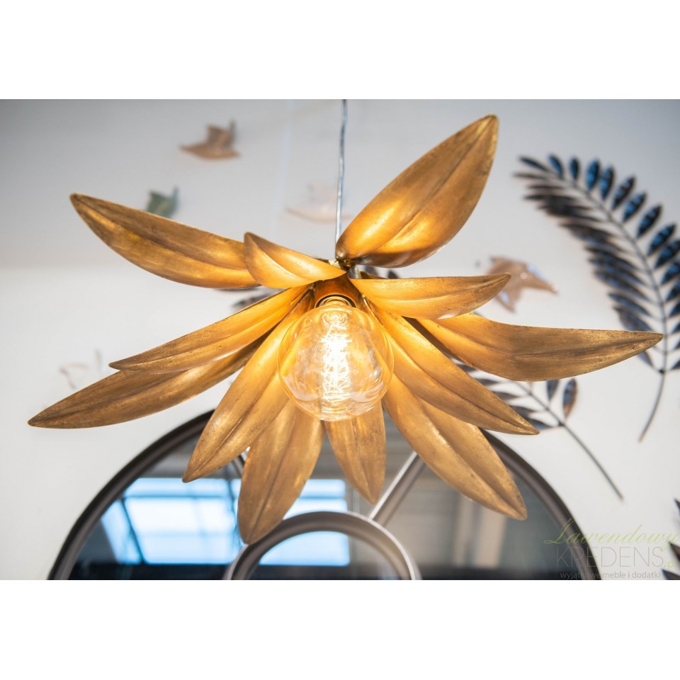 Wykonana z metalu z wykończeniem w kolorze starego złota, lampa sufitowa od francuskiej marki przypomina rozłożyste liście ze szklanym, okrągłym kloszem pośrodku. Ta wyjątkowa lampa ze złotymi liśćmi wspiera Twój inspirowany naturą wystrój wnętrza oraz dodaje odrobinę fantazji w kąciku do czytania lub relaksu. Dodatki do pokoju takie jak złote lampy sufitowe to akcesoria projektowane na miarę potrzeb aranżacji współczesnych i nie tylko. Złote dodatki do domu – najwięcej ofert w jednym miejscu tylko w naszym sklepie online!