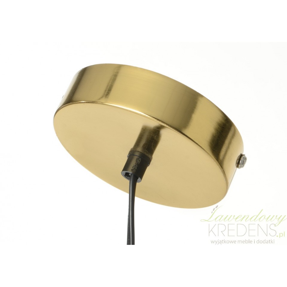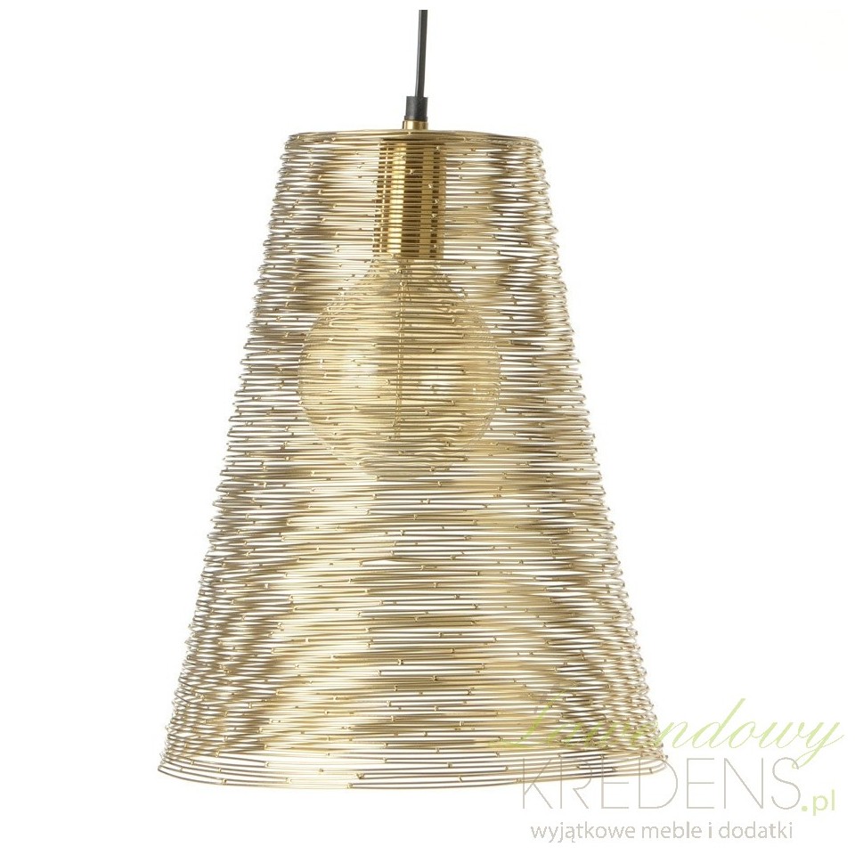 Oto złota lampa sufitowa z unikalnym kloszem o kształcie zbliżonym do stożka wykonanym z drobnych, metalowych drucików.