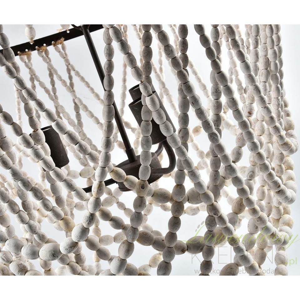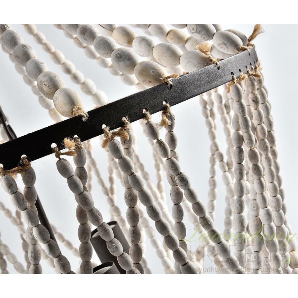 Ta wisząca lampa Belldeco Vintage zdobiona jest sznurami drewnianych koralików zaplecionych pomiędzy metalowymi pierścieniami.