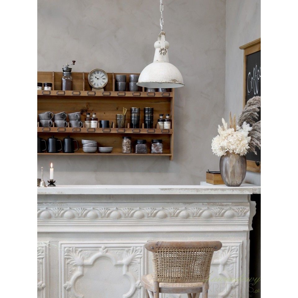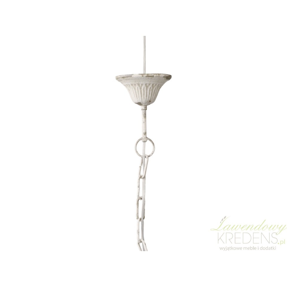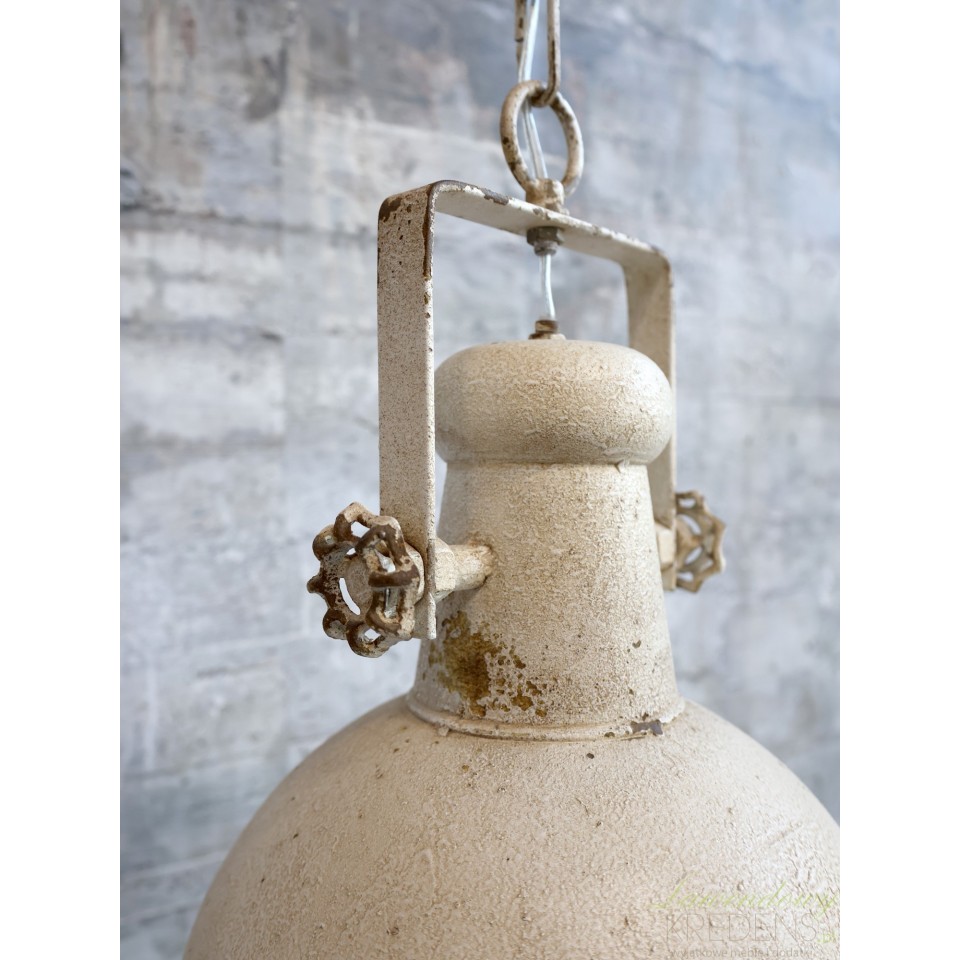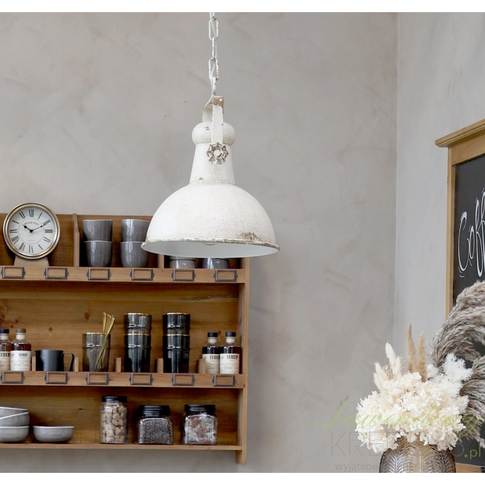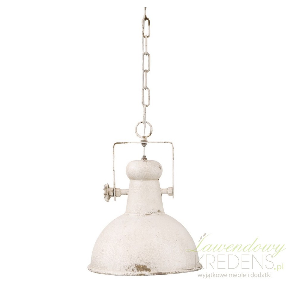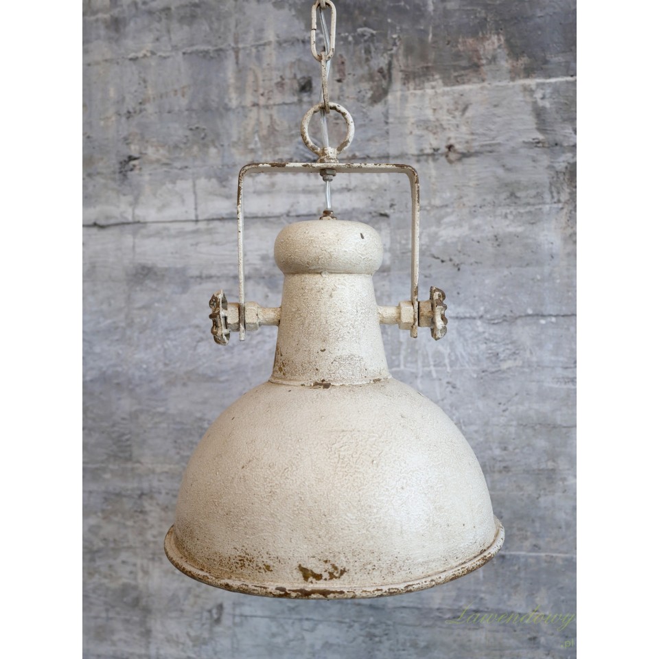 Metalowa, kremowa lampa wykonana w stylu industrialnym i zaprojektowana przez duńską markę Chic Antique. Jest zawieszona na metalowym, kremowym łańcuchu i ma miejsce na jedną żarówkę o gwincie E27.