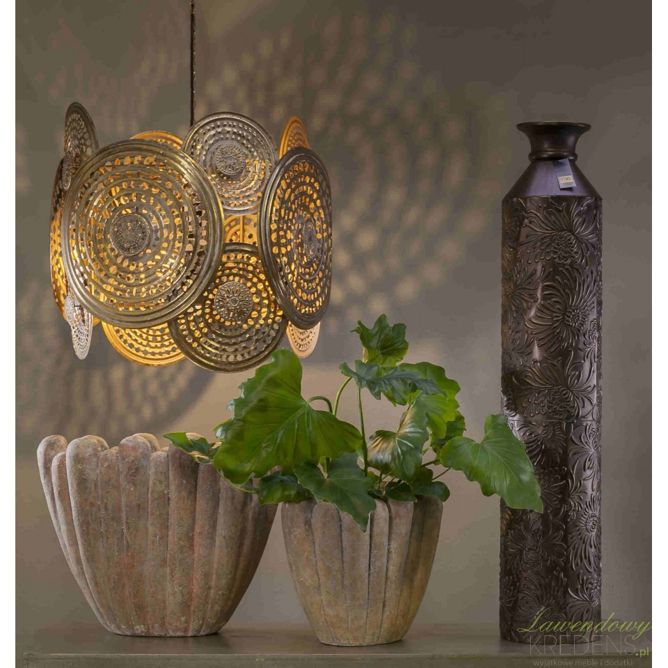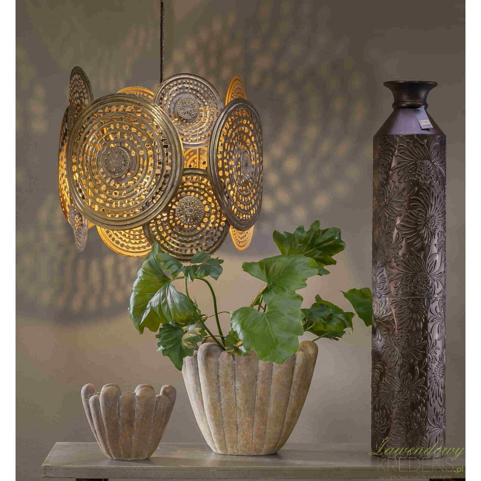 Jeśli irytuje Cię ostre, punktowe światło i widoczna żarówka w salonie lub jadalni, Lampa Wisząca Aluro Kieran rozwiązuje ten problem detalem. Ażurowe, okrągłe tarcze z gęstą perforacją rozpraszają blask i tworzą na ścianach miękką poświatę oraz dekoracyjne cienie. Dzięki temu zyskujesz klimat jak w butikowym hotelu, a nie w przypadkowo doświetlonym pomieszczeniu. Wykończenie w odcieniu postarzanej elegancji przypomina patynę i rzemieślniczą teksturę metalu, więc lampa gra rolę biżuterii wnętrza nawet wtedy, gdy jest zgaszona.Metalowa lampa do jadalni i salonu – jak dopasować Kieran do stołu, wyspy i wysokości sufitu