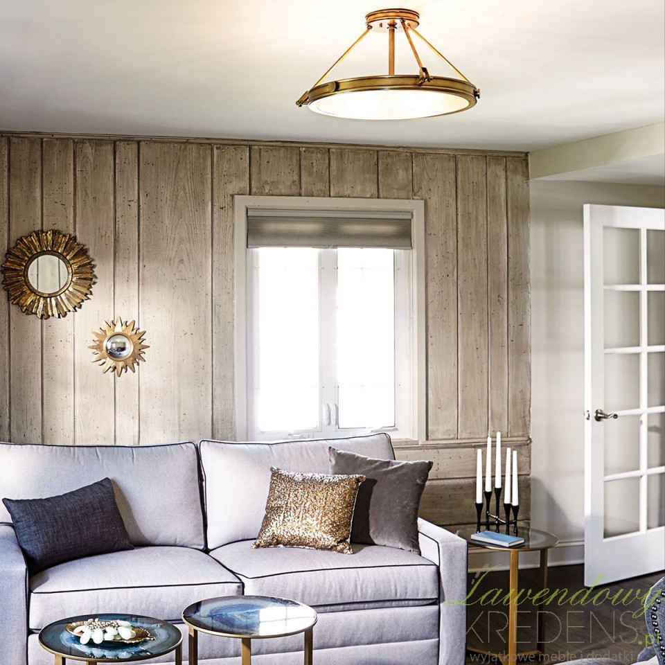 Kolekcja Collier bierze z klasyki to, co najlepsze: odlewane nity, zawiasy i wykończenie w tonacji starego mosiądzu tworzą dekor w duchu retro, ale bez przesady. Ta lampa sufitowa pasuje do wnętrz tradycyjnych, modern classic, a także do mieszkań, w których łączysz drewno, jasne ściany i ciepłe dodatki. Złoty odcień metalu ociepla przestrzeń i świetnie „spina” aranżację z mosiężnymi uchwytami, ramami luster czy armaturą.Praktyczna półplafoniera do codziennego użycia