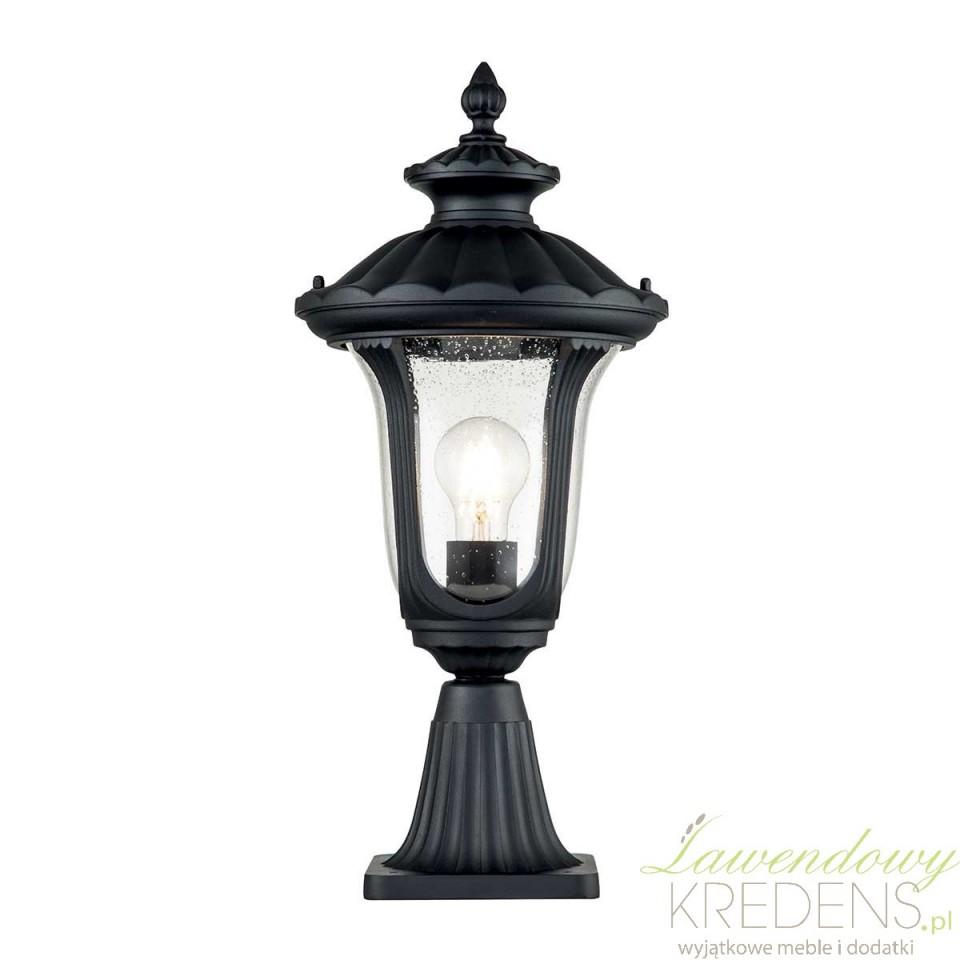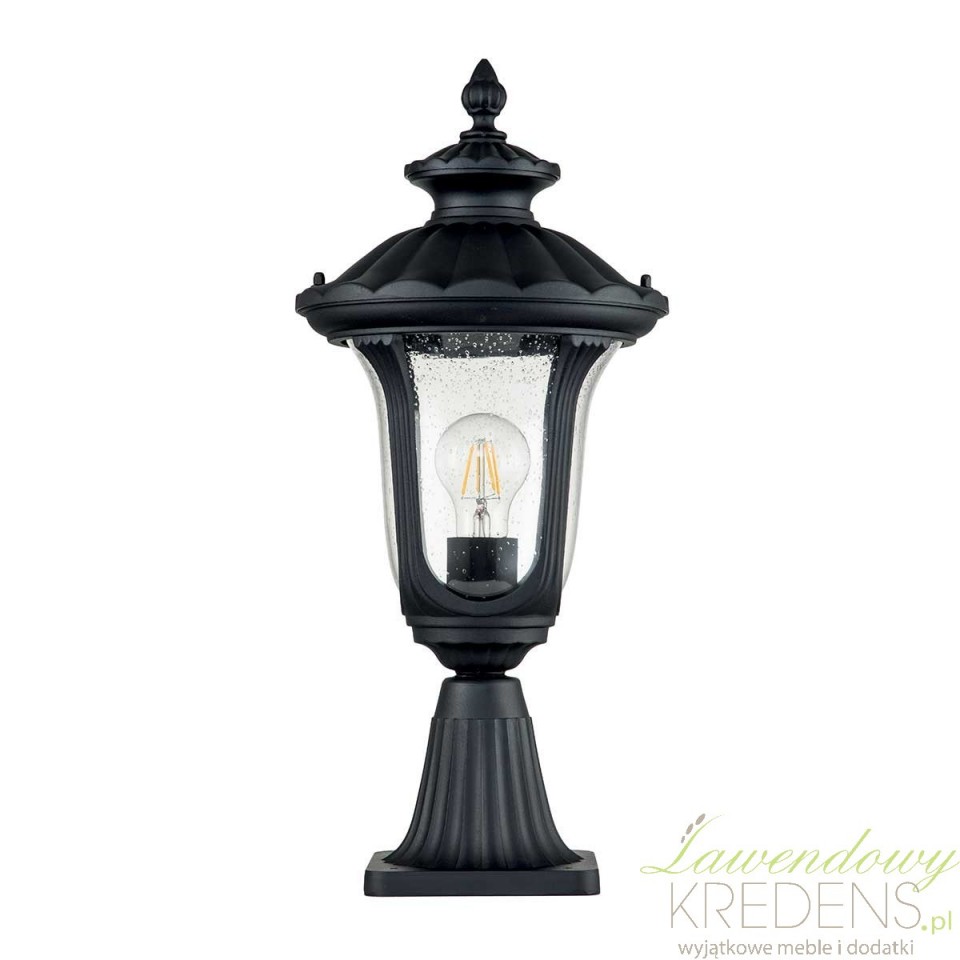 Na uwagę zasługuje też szkło z charakterystycznymi pęcherzykami powietrza. Taka faktura subtelnie rozprasza światło, przez co latarnia daje bardziej nastrojowy, miękki efekt niż proste oprawy o gładkich przeszkleniach. Teksturowana czerń podkreśla rzemieślniczy, lekko postarzany wygląd lampy i dobrze komponuje się z klasycznym oraz rustykalnym otoczeniem.