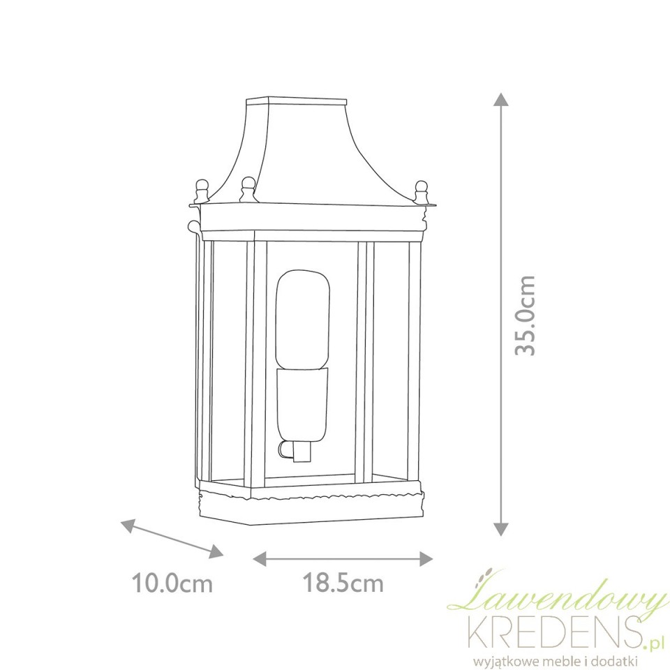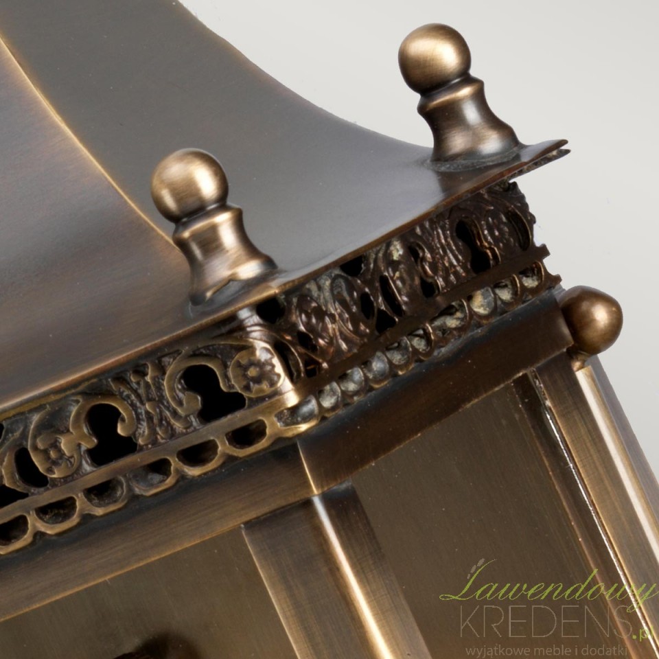 Ręcznie wykonana forma z mosiądzu w postarzanym wykończeniu daje efekt szlachetnej patyny, który ociepla bryłę budynku i pasuje zarówno do domu miejskiego, jak i wiejskiego. Lakierowane wykończenie zwiększa trwałość powierzchni, dzięki czemu lampa dłużej zachowuje estetyczny wygląd. To dobry wybór, gdy szukasz oświetlenia zewnętrznego premium, które nie wygląda masowo.