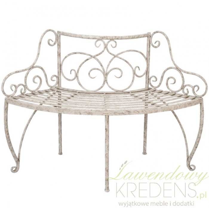 Półokrągła wypukle ławka prowansalska, reprezentująca meble ogrodowe w najciekawszym i najpiękniejszym wykonaniu. Wsparta została na odpowiednio do konstrukcji rozmieszczonych nóżkach, a jej powierzchnia została celowo wykońcozna zadrapaniami, aby dopełnić klimatu rodem z tajemniczego ogrodu!