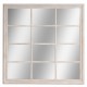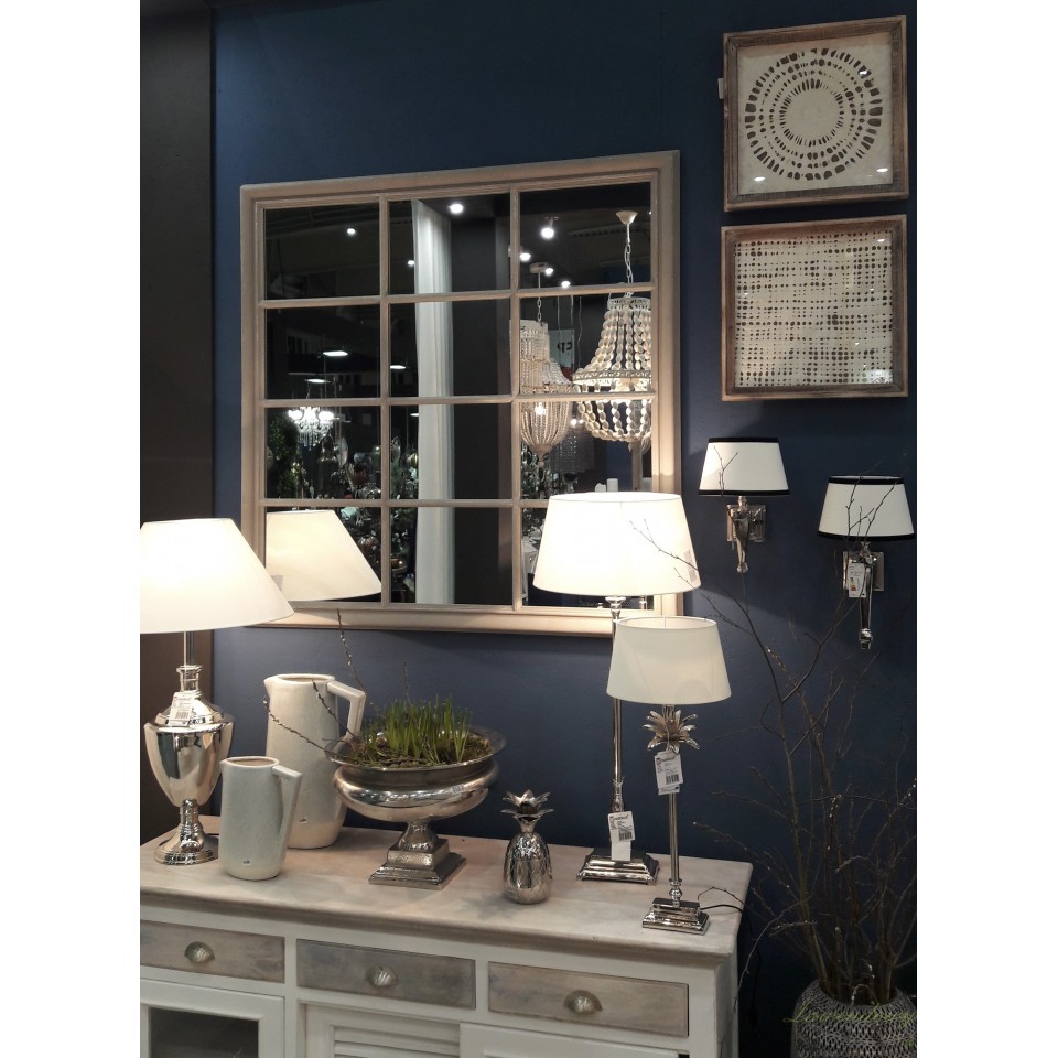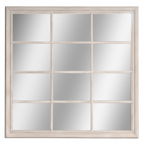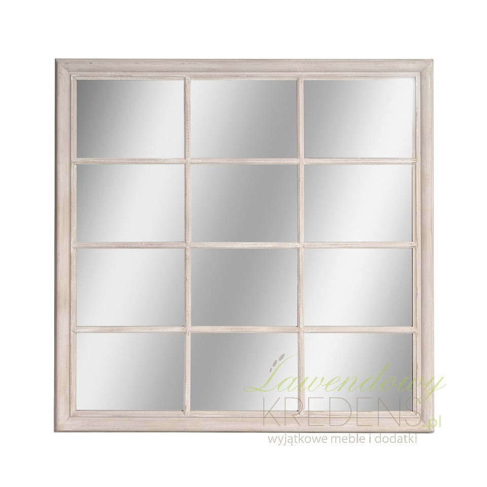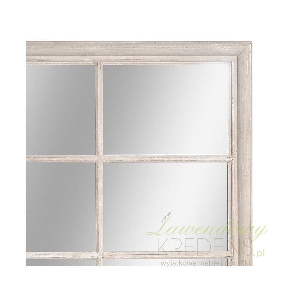 Lustro Belldeco z serii Bosco to duże lustro w stylu prowansalskim, którego rama wykonana z nielakierowanego, matowego drewna paulownia jest celowo postarzana poprzez białe i delikatne, brązowe przetarcia. Uchwyty lustra pozwalają na powieszenie go w dwóch pozycjach: w jednej prostkąty, na które podzielona jest tafla lustra będą poziomo, a w drugiej cztery prostokąty będą obok siebie "stały" pionowo.