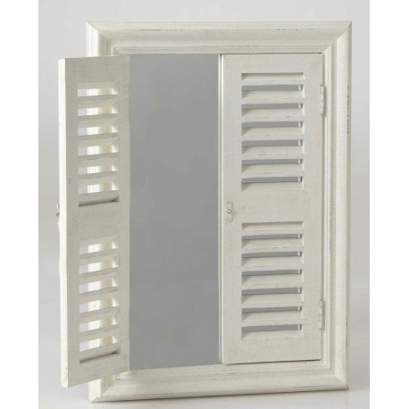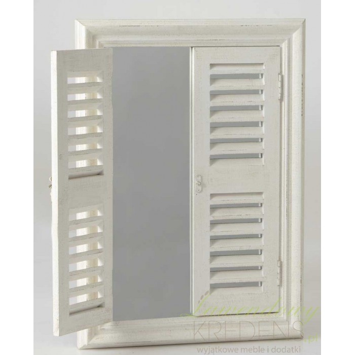 Prostokątne lustro okno w białym kolorze z delikatnymi przetarciami wyposażone w dwa piękne ażurowe skrzydła.