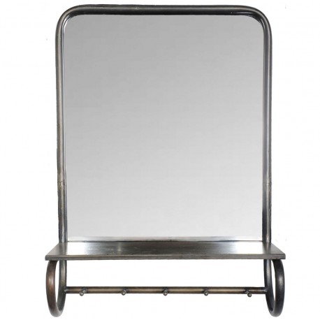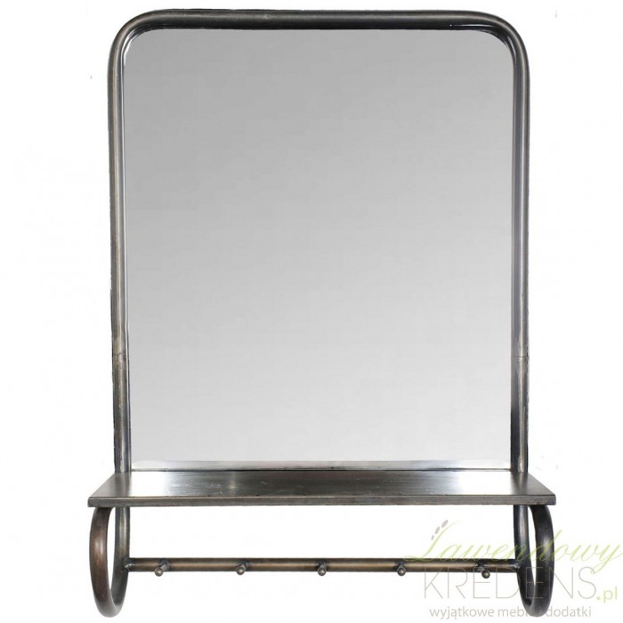 Lustro loft w kształcie prostokąta ma metalowe obramowanie i metalową półkę u dołu. Pod półką znajduje się prosty drążek z pięcioma uchwytami, na których zawiesisz ręcznik lub ściereczkę i nie tylko. Metalowe elementy noszą delikatne ślady rdzawych postarzeń. Lustro loft dedykujemy szczególnie łazienkowym wnętrzom!