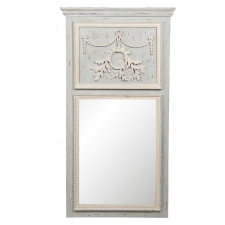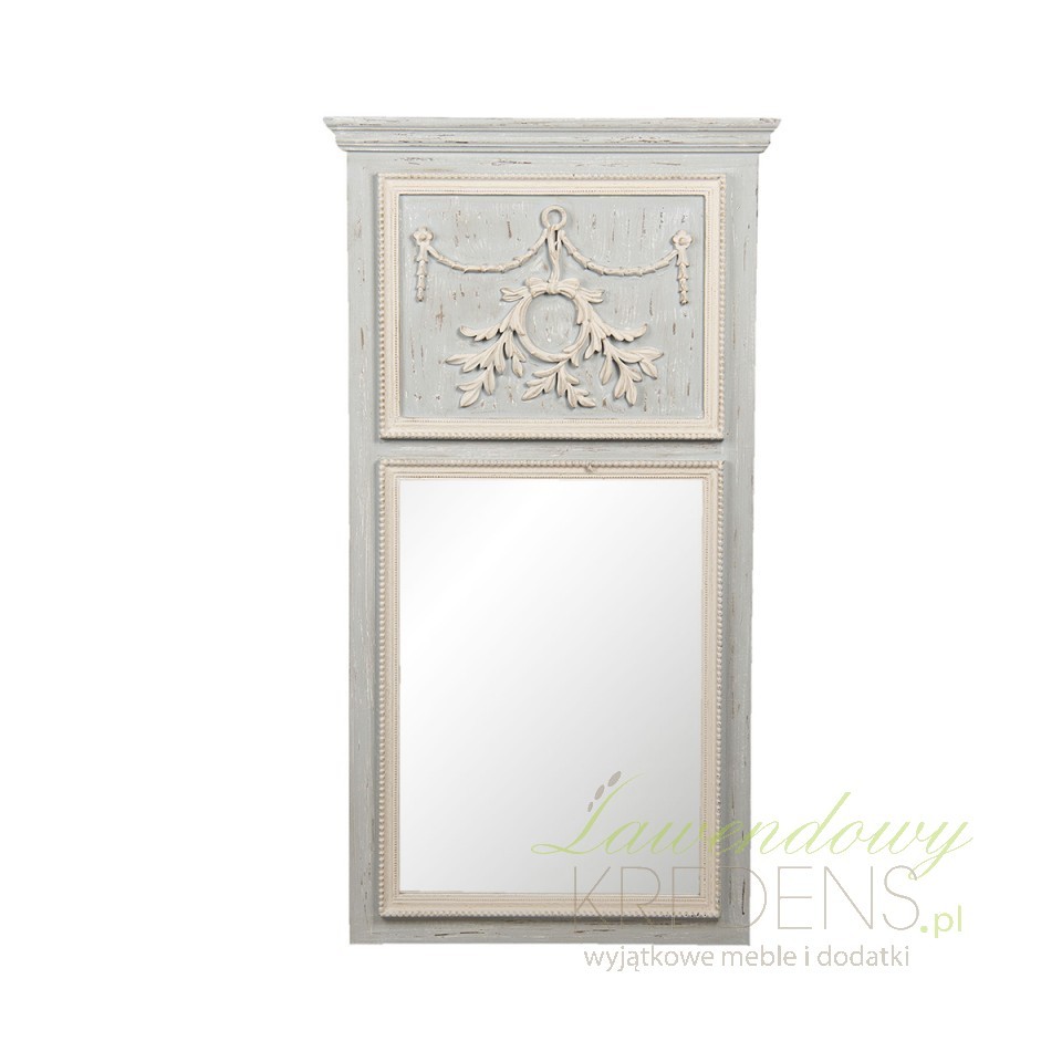 Szare lustro w stylu prowansalskim z dekorem jest wzorowane na klasycznych rzeźbach ram z końca XIX wieku.