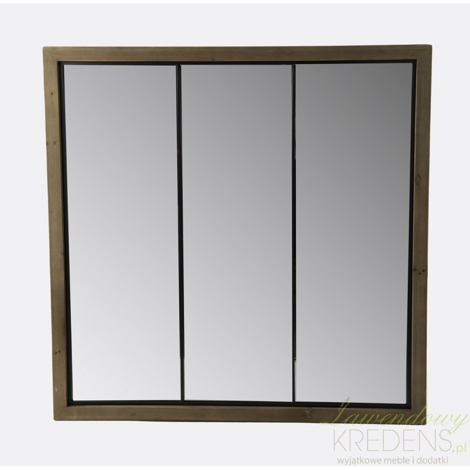 Prezentowane lustro okno oprawione w drewnianą ramę w naturalnym kolorze ciemnego dębu ma kształt kwadratu i metalowe, pionowe szprosy.