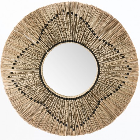 Oczaruj swoich gości wieszając na ścianie w salonie okrągłe lustra w stylu boho w ramie wykonanej z suszonej trawy.