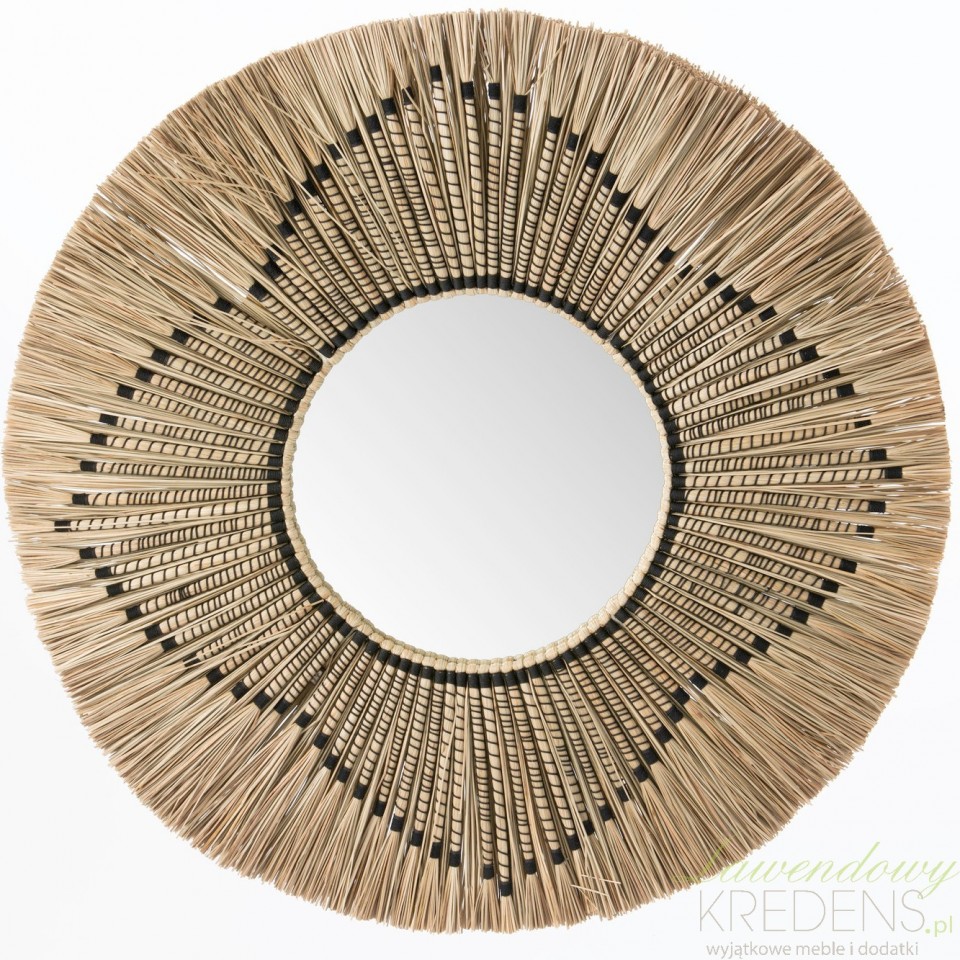 Dodaj efekt „WOW” do swojego domu, wybierając dekoracje w stylu boho. Do salonu proponujemy okrągłe lustro w stylu boho w ramie z suszonej trawy z ozdobnym, czarnym wzorem, które doda Twojej aranżacji elegancji w stylu vintage. To idealne lustro, w bardzo dużym rozmiarze odważnie uzupełni puste miejsce na ścianie, wpisując się w stylistykę pomieszczenia. Lustra boho możesz wygodnie zamontować na dowolnej ścianie.