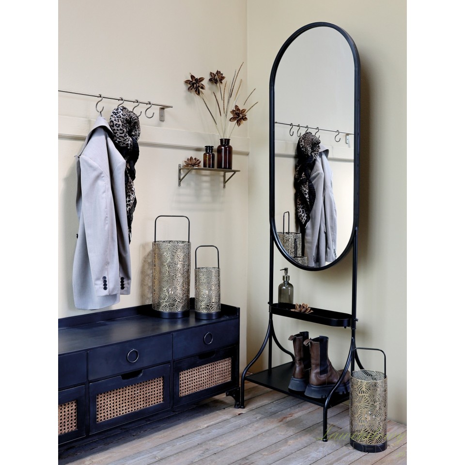 Wysokiej jakości lustro podłogowe industrialne Chic Antique dostarczane jest z już zainstalowanymi półkami, które zapewniają miejsce na buty w przedpokoju lub pudełka z dodatkami w garderobie.