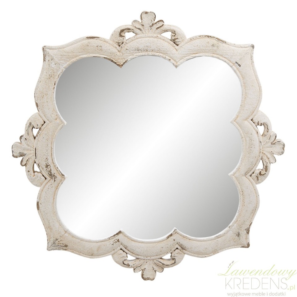 Lustro prowansalskie kremowe ma nieregularny kształt zbliżony do kwadratu. Jego ramę zdobią dekoracyjne, przyciągające spojrzenia ornamenty.