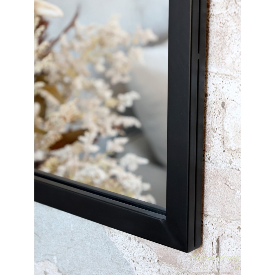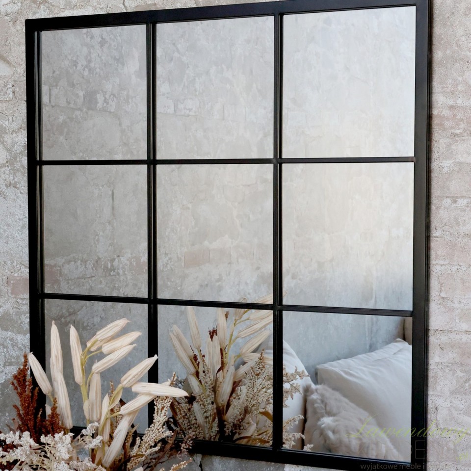 To, co wyróżnia to lustro, to jego niezwykłe okno-podobne wzornictwo. Metalowe szprosy podzielają powierzchnię na mniejsze sekcje, tworząc wrażenie, jakbyśmy patrzyli przez autentyczne okno. To nie tylko świetne narzędzie do optycznego powiększania przestrzeni, ale również wyraz artystycznej wizji, która wtapia się we wnętrze.