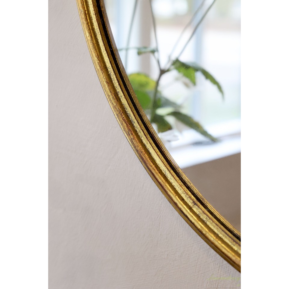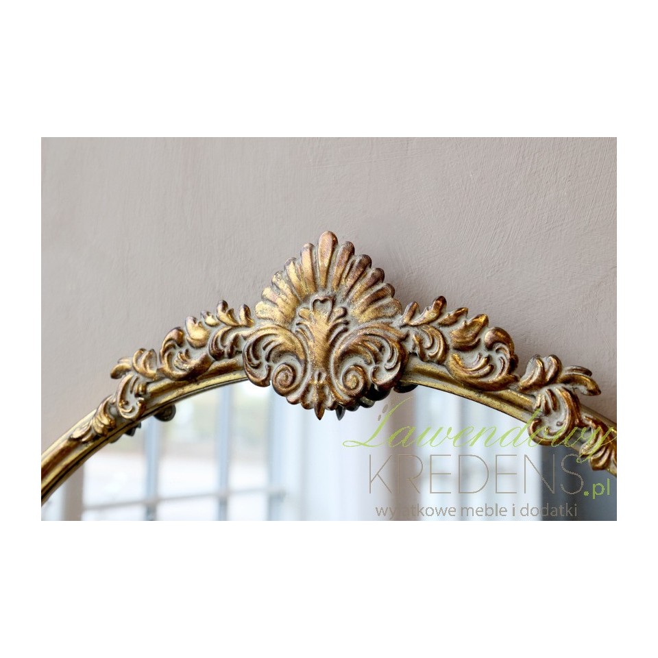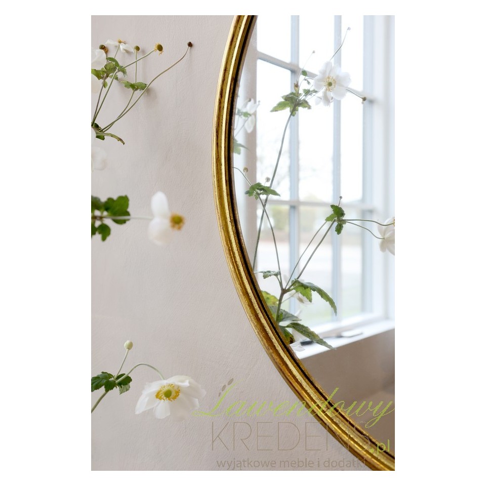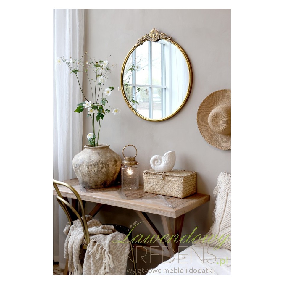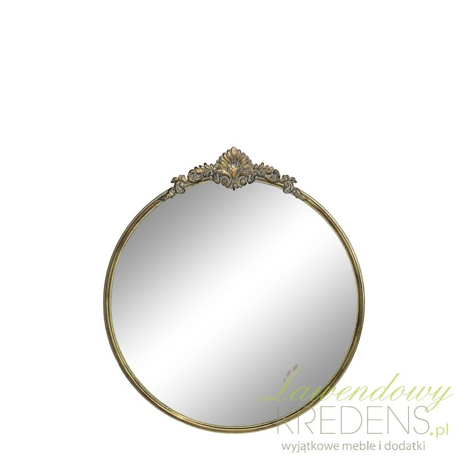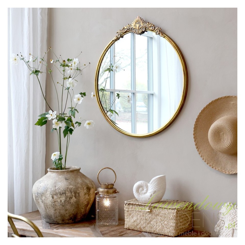 Lustro ma elegancki, okrągły kształt i ozdobną ramę w kolorze mosiądzu z dekoracyjnym akcentem w górnej części – motywem florystycznym w starym stylu. Rama jest wąska, ale efektownie podkreśla lustrzaną taflę, dodając jej charakteru i lekko pałacowego uroku. Lustro doskonale wpisuje się w romantyczne jak i bardziej surowe wnętrza, pełniąc nie tylko funkcję praktyczną, ale też dekoracyjną. Świetnie sprawdzi się w salonie, przedpokoju lub sypialni, wprowadzając elegancję i rozświetlając przestrzeń.