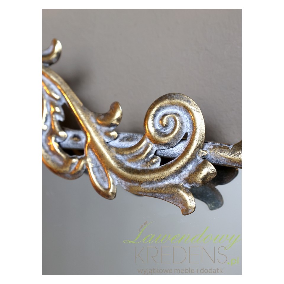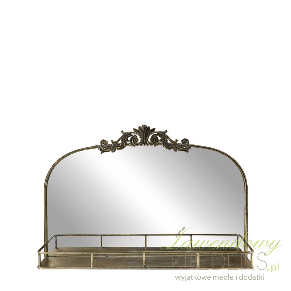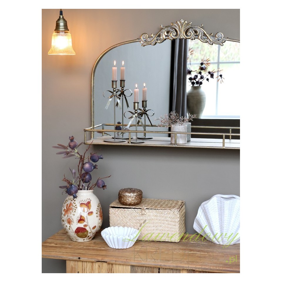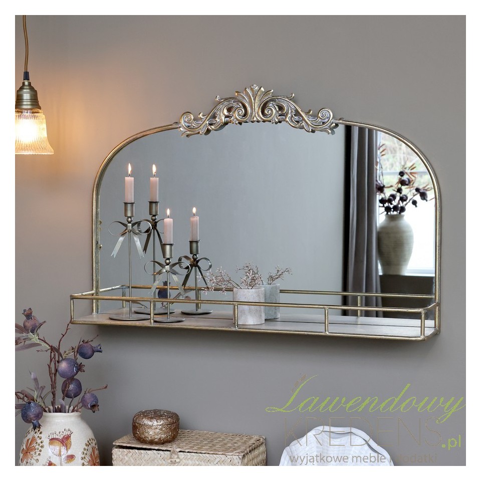 Stylowe lustro z półką i ozdobnym dekorem Chic Antique to wyjątkowy akcent do wnętrz w klimacie vintage i prowansalskim. Połączenie metalu w odcieniu starego złota z funkcjonalną półką tworzy praktyczny i elegancki element aranżacji. Idealnie sprawdzi się w salonie, sypialni czy przedpokoju, dodając charakteru każdemu wnętrzu.