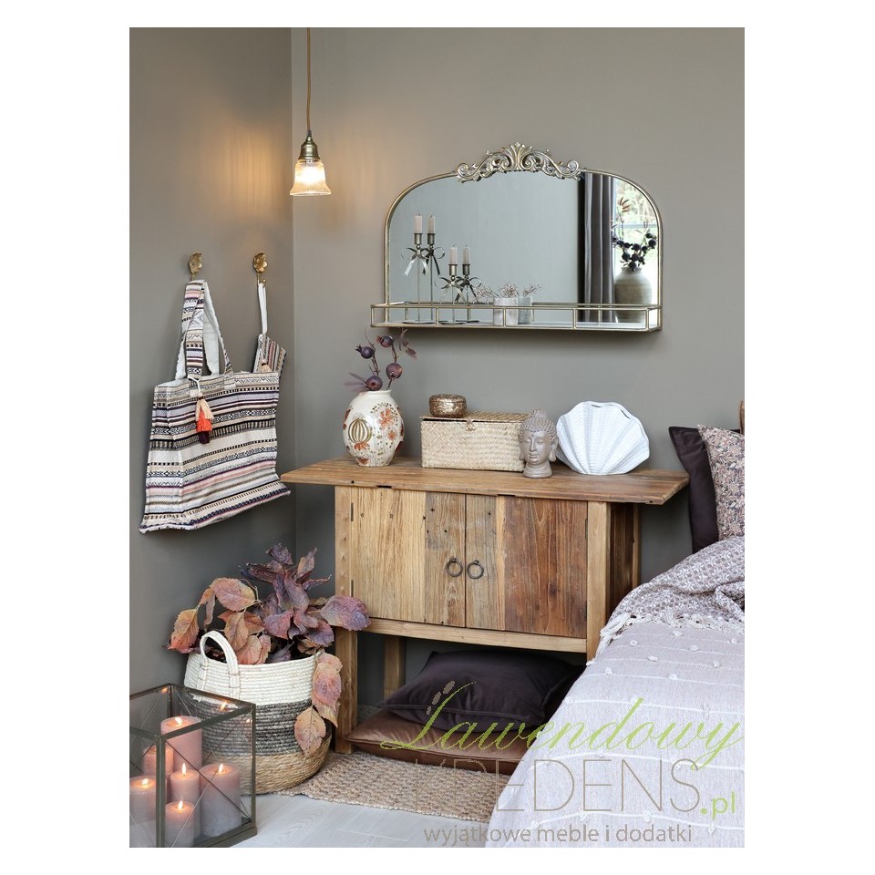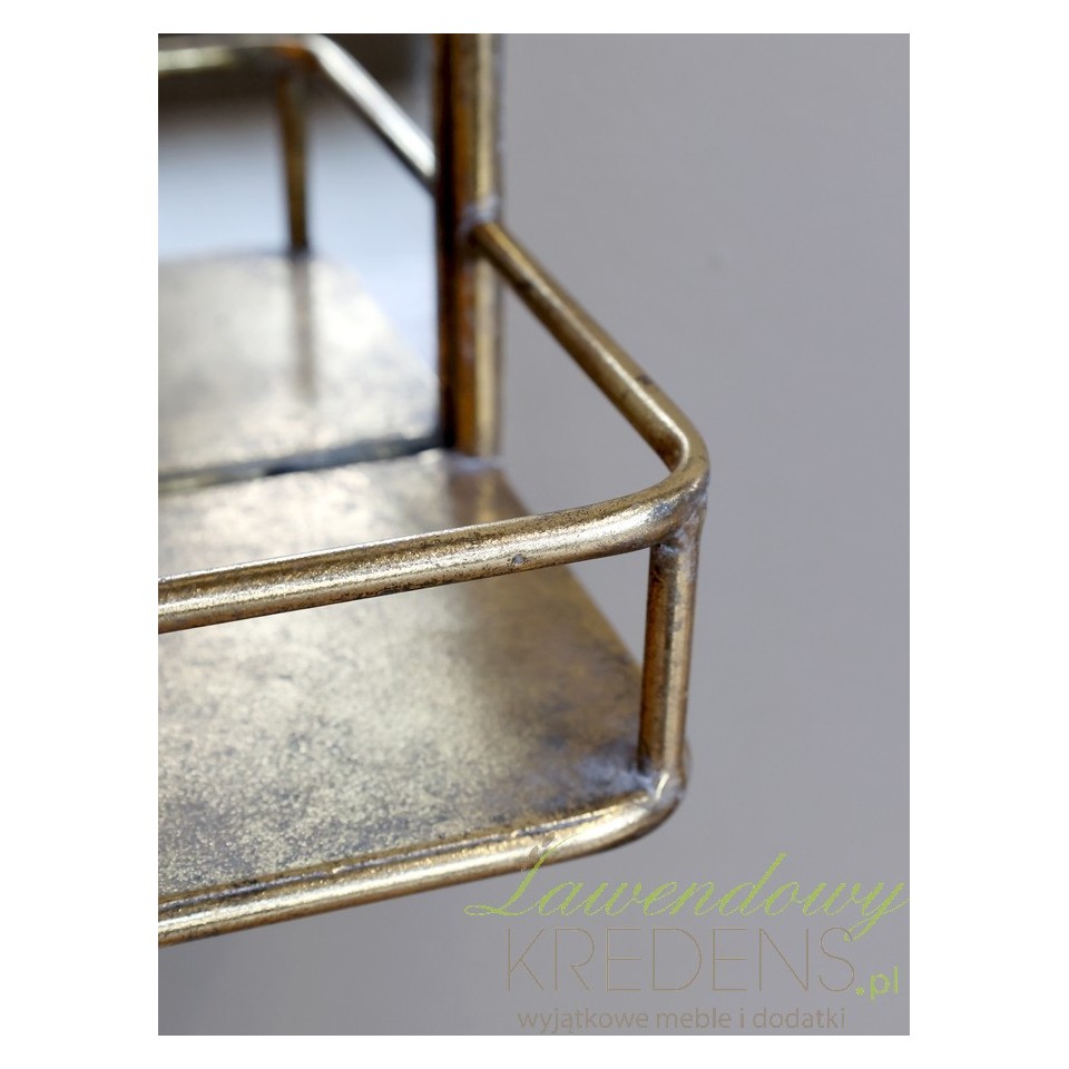 Umieszczona pod taflą lustra półka pełni rolę zarówno ozdobną, jak i użytkową. To idealne miejsce na świece, drobne dekoracje czy kosmetyki, co sprawia, że mebel zyskuje dodatkowy wymiar praktyczności. Dzięki temu lustro świetnie odnajduje się nie tylko w salonie, ale również w sypialni, garderobie czy przedpokoju. Jego solidna konstrukcja zapewnia stabilność, a złote wykończenie podkreśla luksusowy charakter.