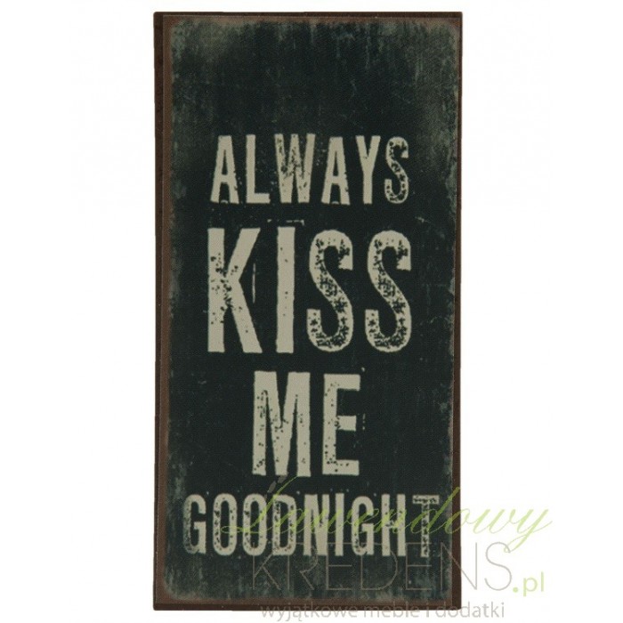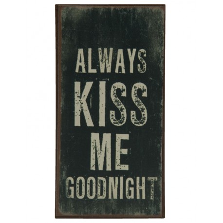Dodatki do kuchni, w tym magnesy na lodówkę to nowoczesny sposób wyrażania swoich emocji. Magnes na lodówkę firmy Clayre & Eef ma czarny kolor i duży, biały angielski napis: Always kiss me goodnight. Ma kształt prostokąta i jest postarzany, sprawiając wrażenie starego i zniszczonego.