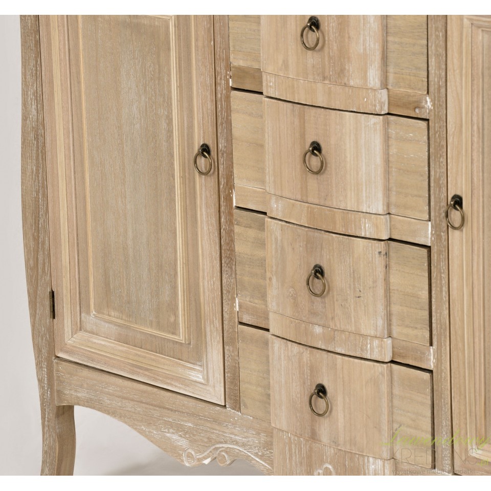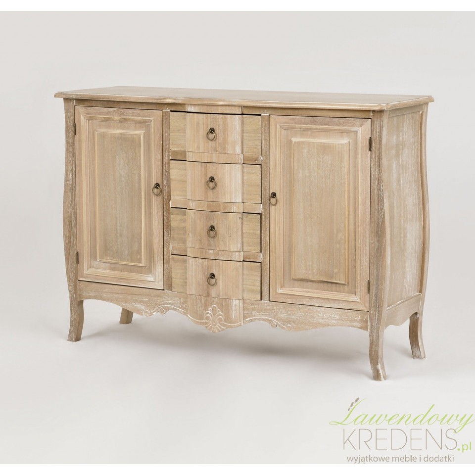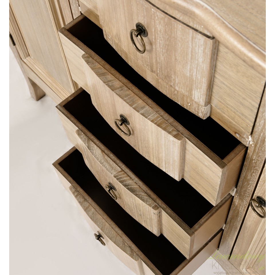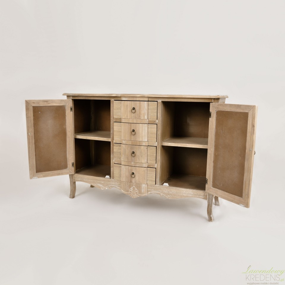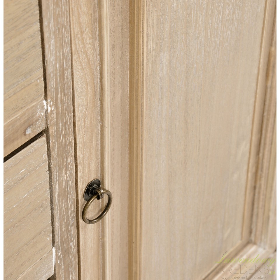 Szeroka komoda prowansaska z litego, bielonego drewna topoli. Komoda posiada półki ukryte za dwoma drzwiczkami oraz cztery szuflady z metalowymi uchwytami w kształcie kółek. Komoda jest bardzo pojemna i praktyczna, sprawdzi się zarówno w sypialni jak i w salonie.