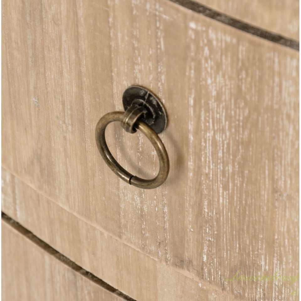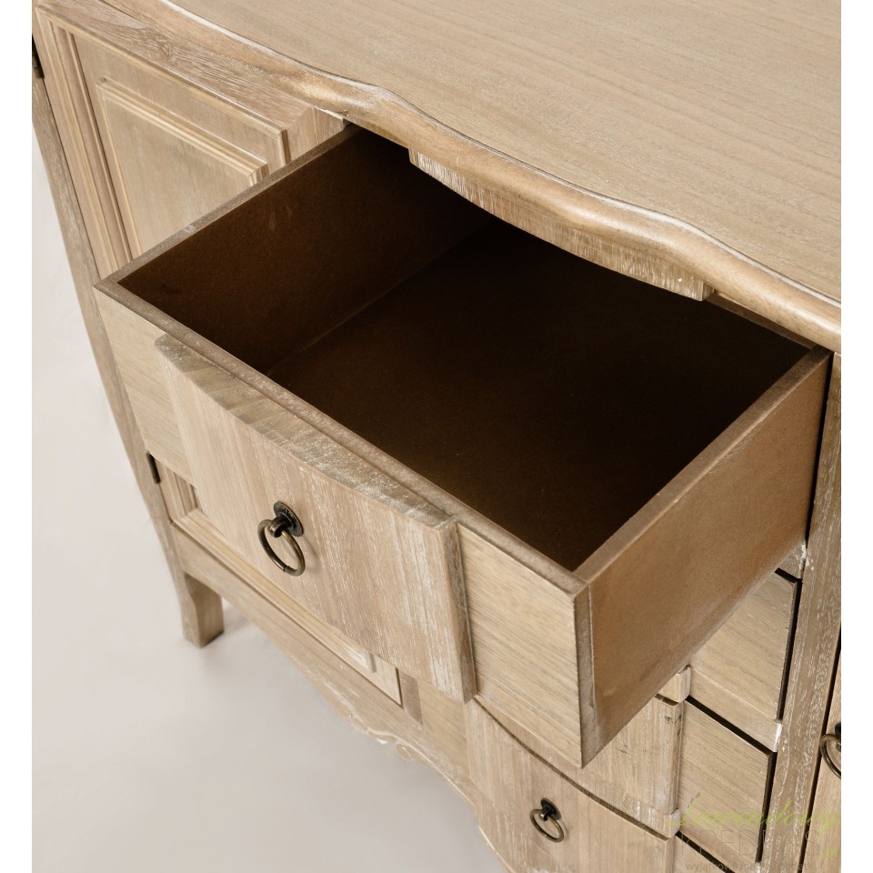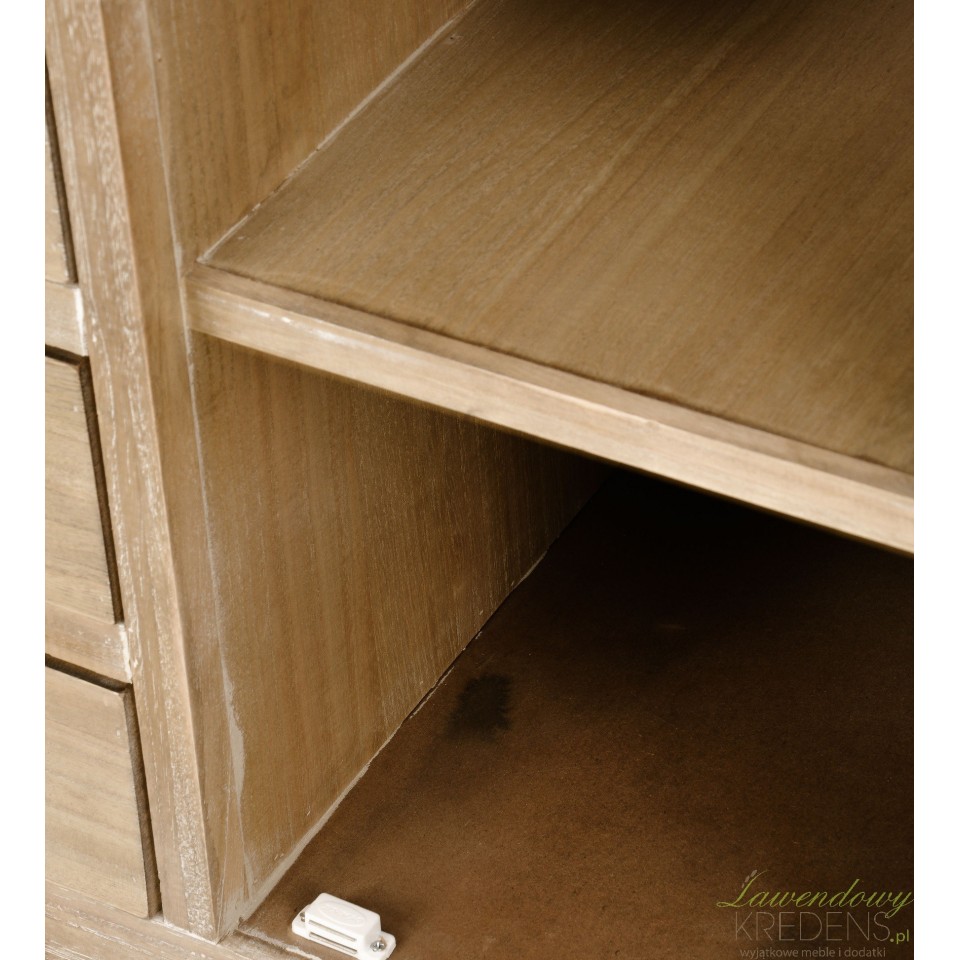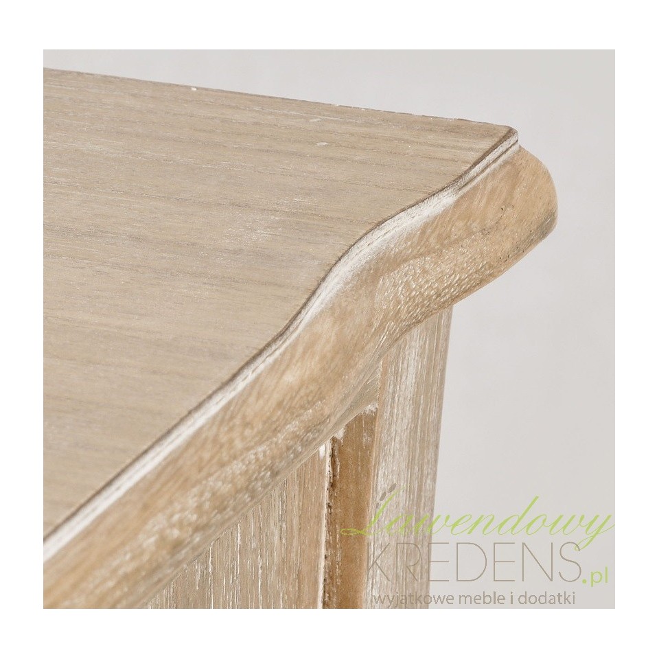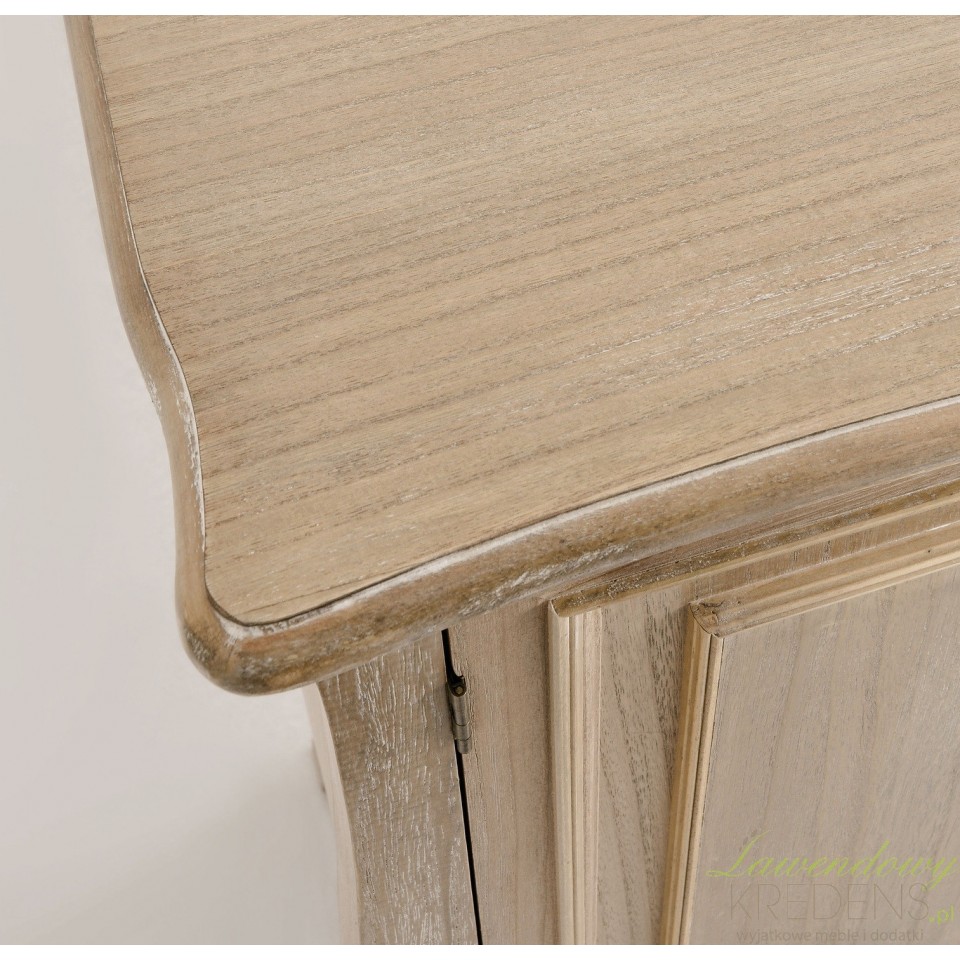 Szeroka komoda prowansaska z litego, bielonego drewna topoli. Komoda posiada półki ukryte za dwoma drzwiczkami oraz cztery szuflady z metalowymi uchwytami w kształcie kółek. Komoda jest bardzo pojemna i praktyczna, sprawdzi się zarówno w sypialni jak i w salonie.