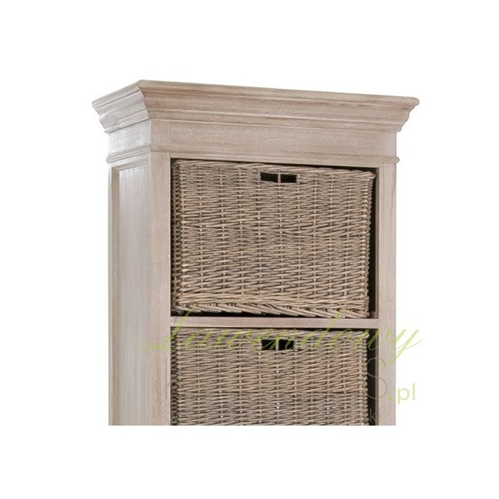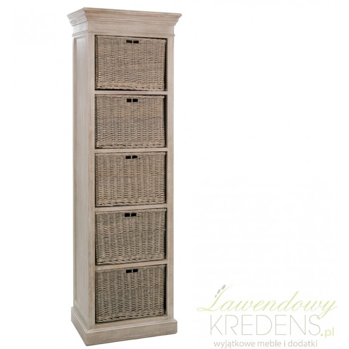 Wysoki i zgrabny, bo nie zajmujący dużo przestrzeni mebel to regał bielony z plecionymi koszami. Bielony korpus mebla i chłodny odcień brązu doskonale wkomponuja się w każdą aranżacje wnętrzarska. Regały prowansalskie do codziennego użytku tylko u nas!