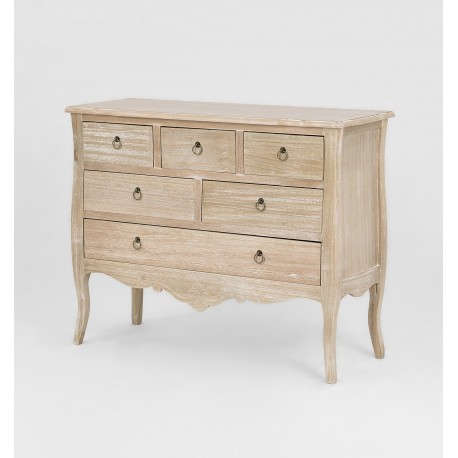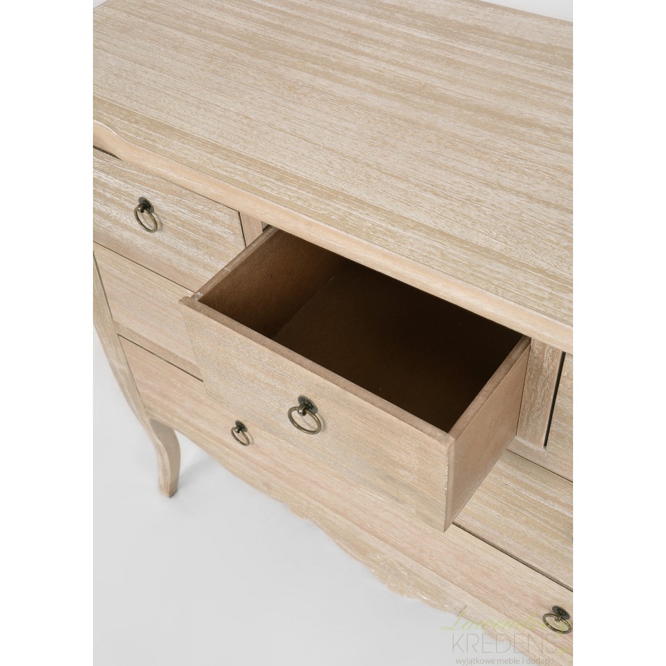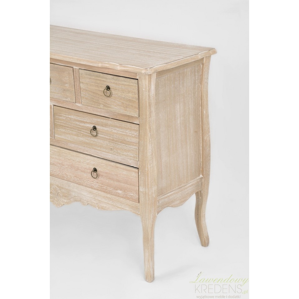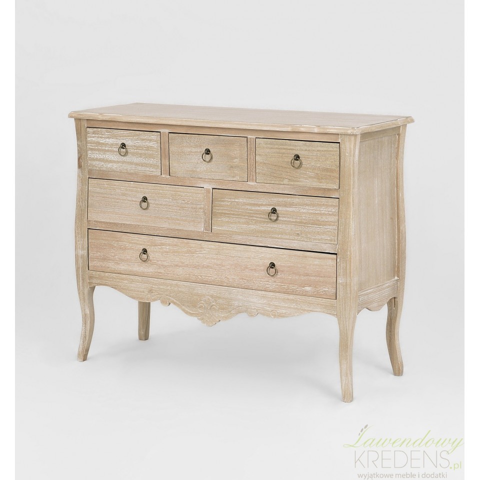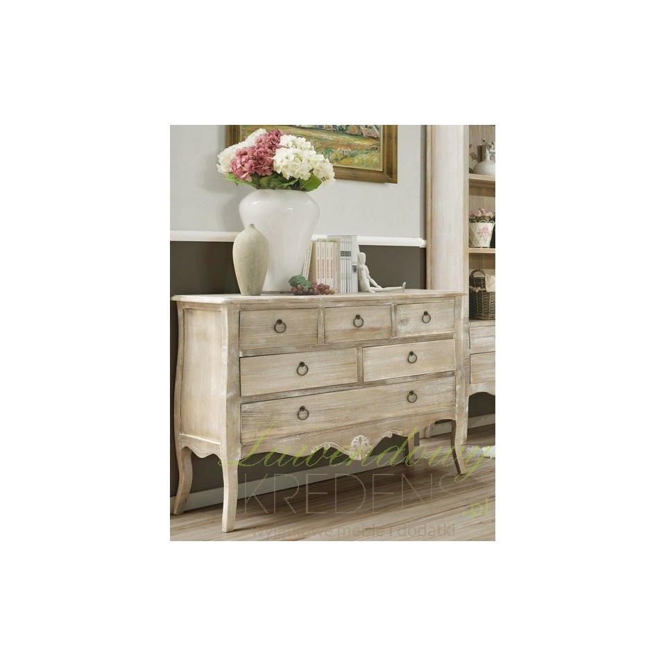 Bielona komoda prowansalska wykonana z litego drewna topoli oraz MDFu. Komoda posiada sześć szuflad o różnej wielkości, otwieranych metalowymi uchwytami w kształcie koła. Powierzchnia komody ma matowe wykończenie. Do zestawu polecamy inne meble prowansalskie z tej samej kolekcji mebli.