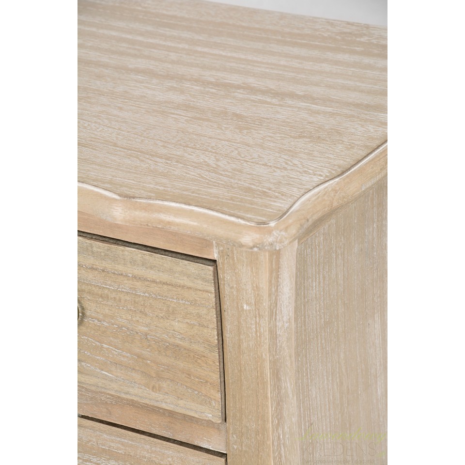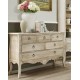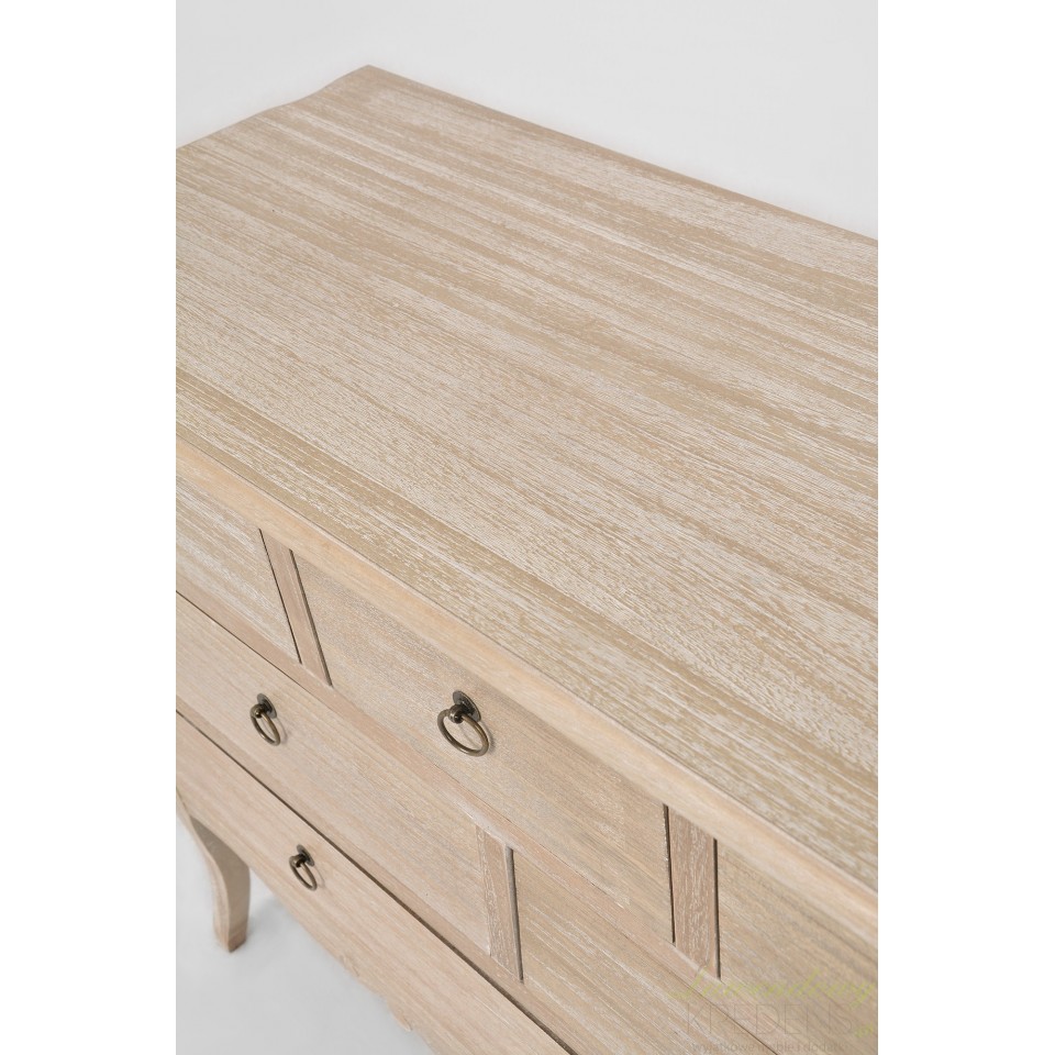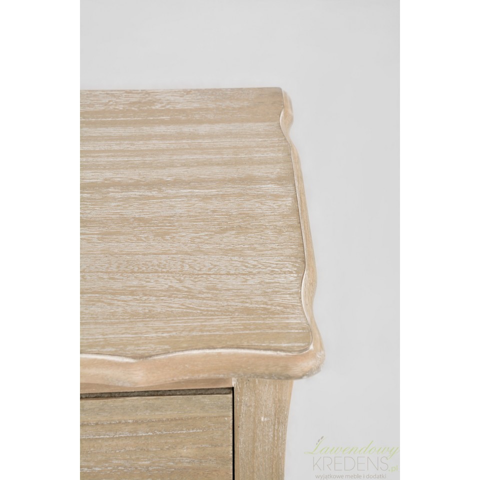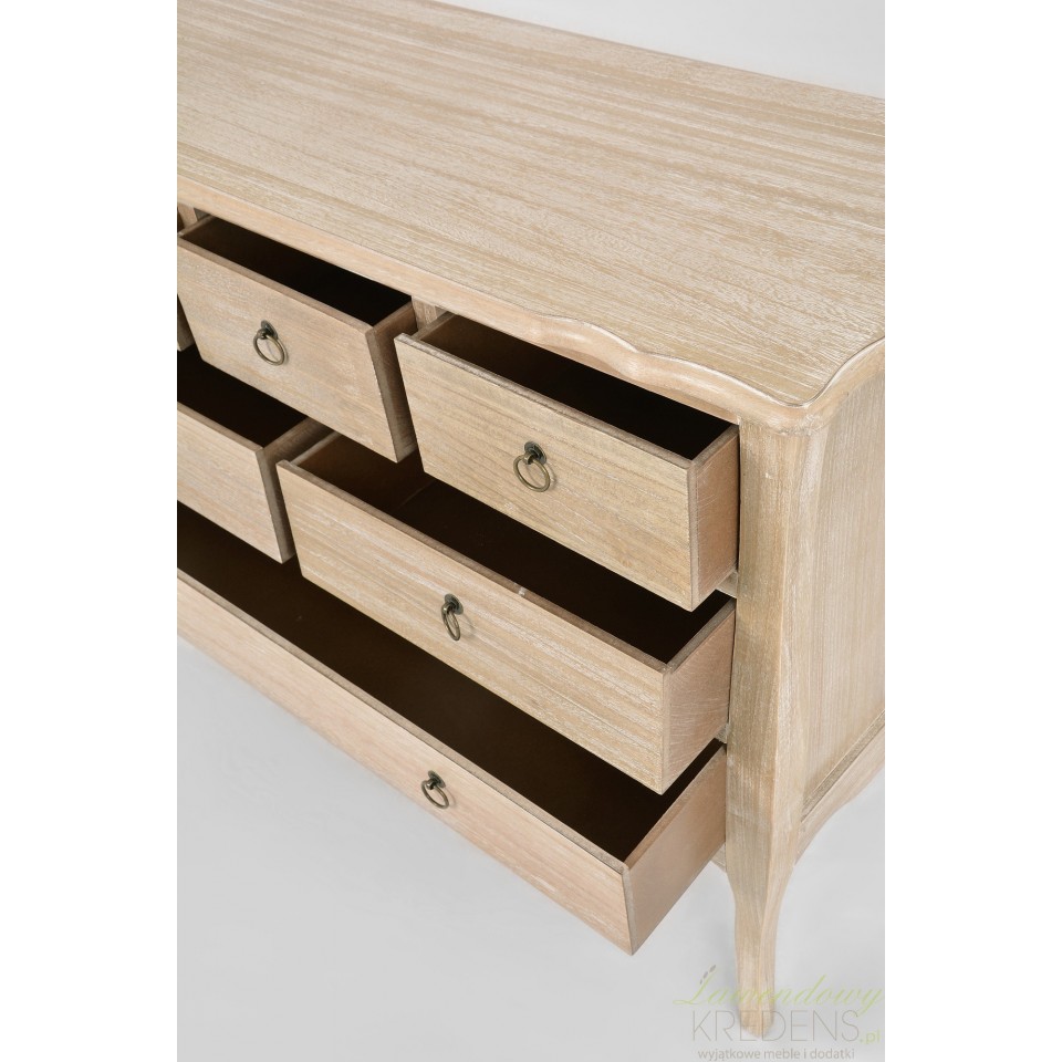 Bielona komoda prowansalska wykonana z litego drewna topoli oraz MDFu. Komoda posiada sześć szuflad o różnej wielkości, otwieranych metalowymi uchwytami w kształcie koła. Powierzchnia komody ma matowe wykończenie. Do zestawu polecamy inne meble prowansalskie z tej samej kolekcji mebli.