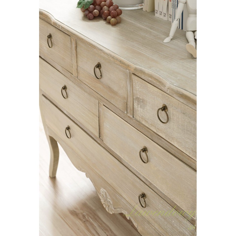 Bielona komoda w stylu prowansalskim posiadająca sześć szuflad z metalowymi uchwytami.