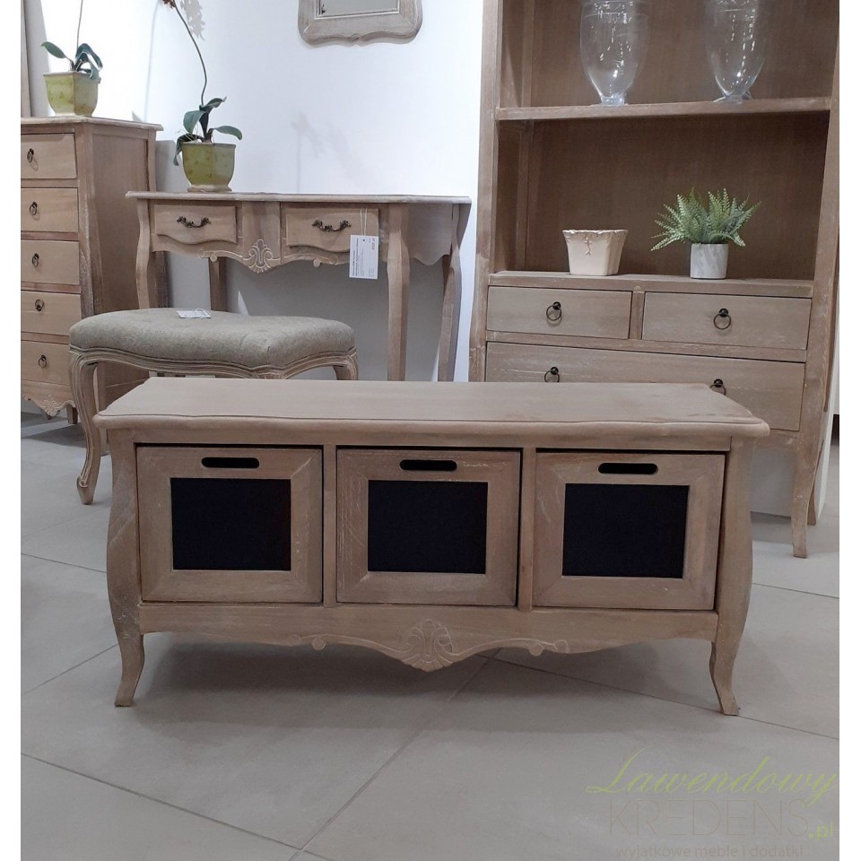 Niska komoda prowansalska z trzema szufladami, których fronty są tablicami do pisania kredą.