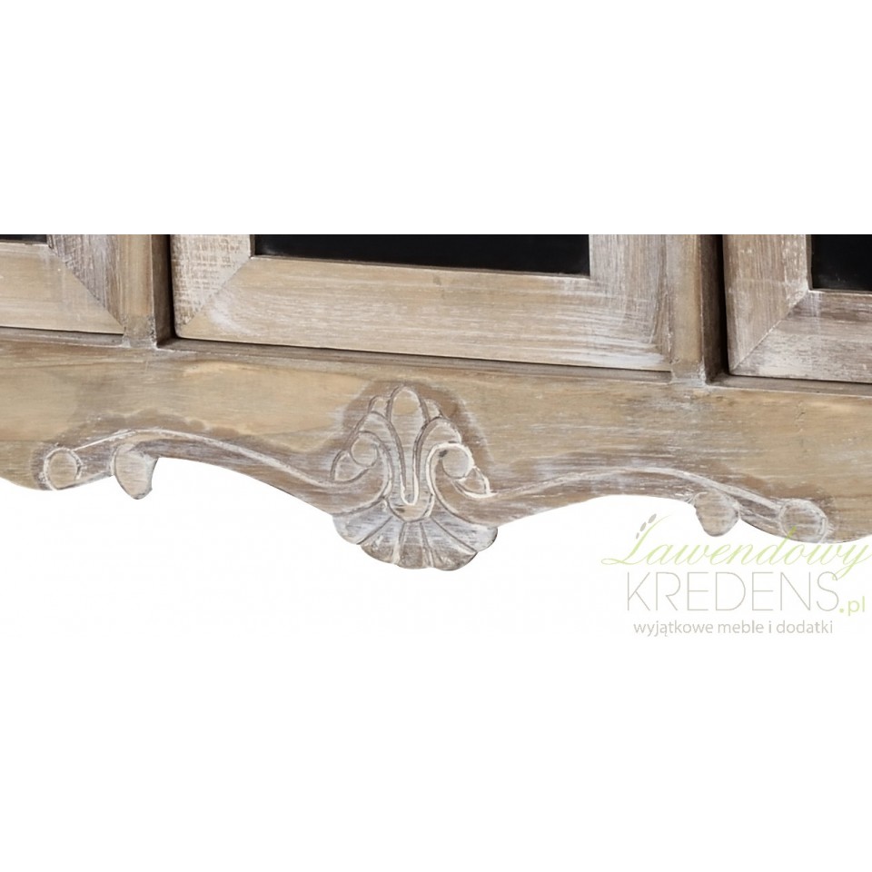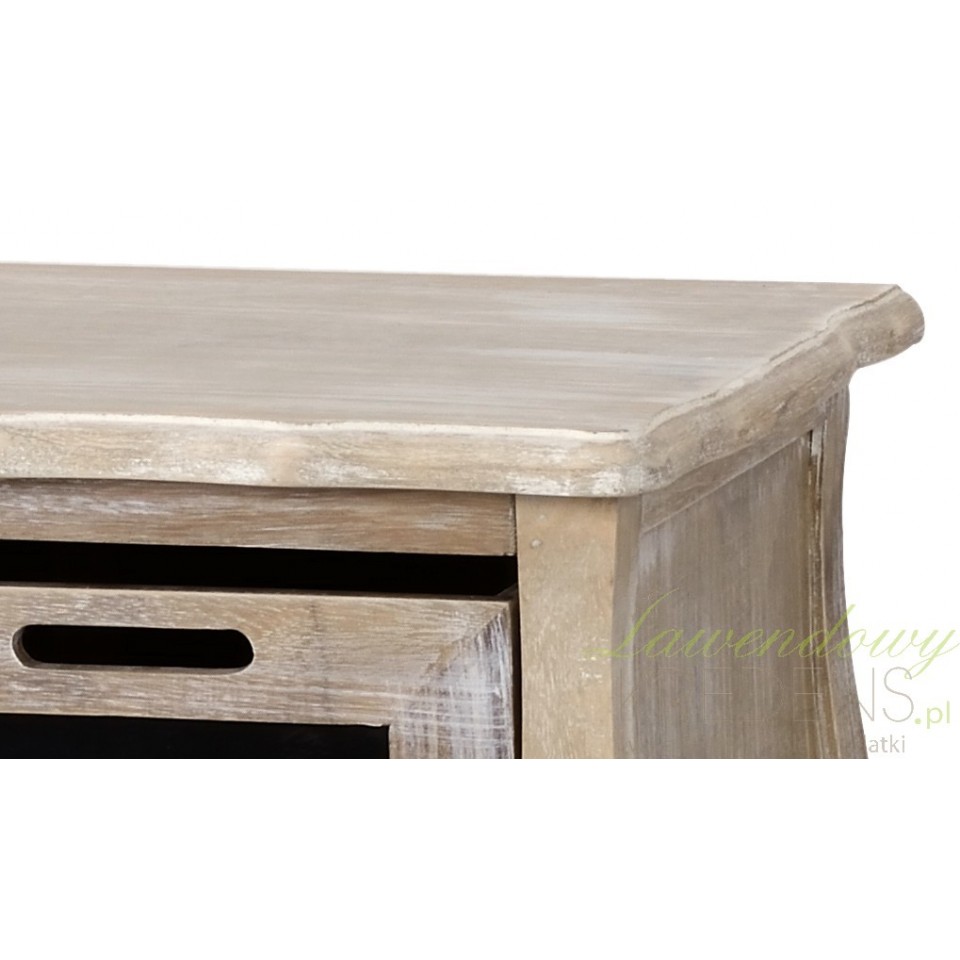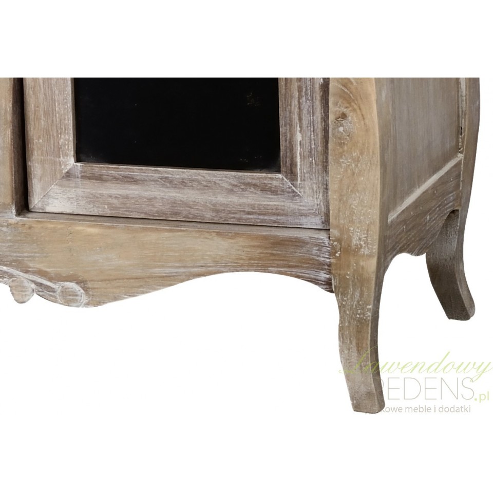 Bielona komoda w stylu prowansalskim z trzema szufladami. Fronty szuflad są jednocześnie tablicami do pisania kredą. Komoda wykonana jest z litego drewna topoli oraz płyty MDF. Jej powierzchnia jest matowa i bielona. Komoda może zostać wykorzystana na przykład jako komoda pod telewizor lub komoda na zabawki do pokoju dziecka. To komody można dobrać inne bielone meble prowansalskie o tej samej kolorystyce.