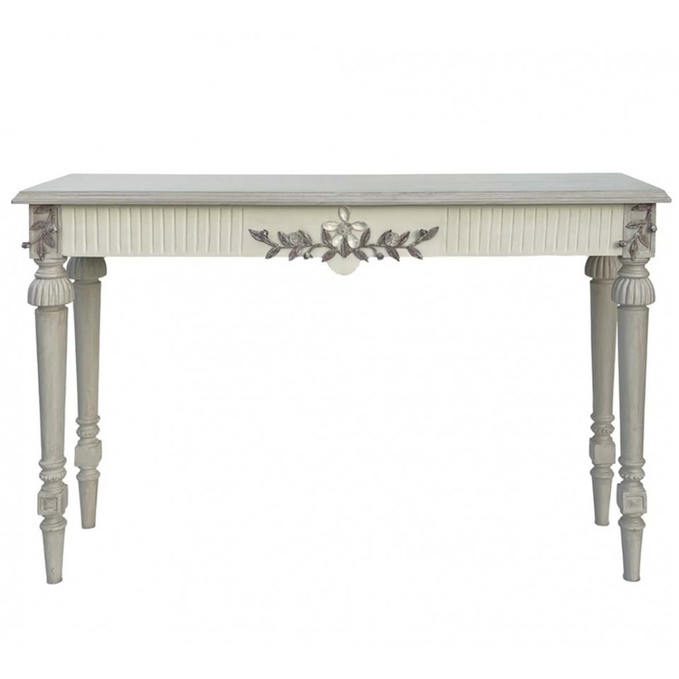 Smukła konstrukcja z subtelnie zdobionymi nogami harmonijnie łączy lekkość i stabilność. Konsola doskonale sprawdzi się w eleganckim przedpokoju, gdzie może pełnić funkcję praktycznej półki na dekoracje, wazon z kwiatami czy elegancką lampę. W salonie stworzy stylowy kącik z lustrem i świecami, podkreślając przytulny klimat wnętrza. Można ją także wykorzystać w sypialni jako romantyczną toaletkę lub delikatne biurko do pisania listów i przechowywania drobnych akcesoriów.