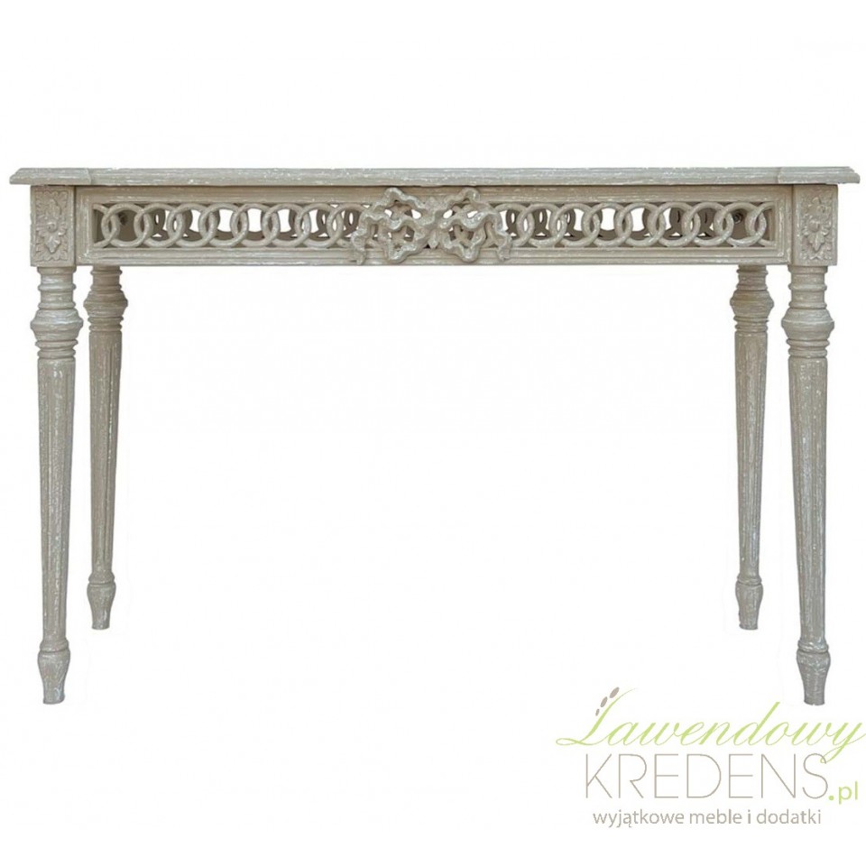 Pod blatem konsoli znajduje się ażurowy cokół ozdobny, który przyciąga wzrok finezją wykonania i dodaje meblowi lekkości. Proste, ale rzeźbione nogi są harmonijnym dopełnieniem całości, zapewniając nie tylko stabilność, ale także wyrafinowany wygląd. Konsola doskonale sprawdzi się w przedpokoju, gdzie stanie się miejscem na klucze, dekoracje czy lustro, w salonie jako elegancka baza pod lampę i ozdoby, lub w sypialni, gdzie może pełnić rolę stylowego toaletki.