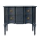 Wykonana z drewna mango, rattanu i mdf, komoda o wymiarach 90 cm szerokości, 82 cm wysokości i 46 cm głębokości wyróżnia się solidną konstrukcją i dopracowanymi detalami. Czarne wykończenie z subtelnym połyskiem wprowadza do wnętrza klasę i wyrafinowanie, a stylizowane nogi, delikatne żłobienia i profilowany front podkreślają jej ludwikowski charakter. Seria Violetta to synonim francuskiej elegancji, która doskonale odnajduje się w romantycznych, klasycznych oraz eklektycznych aranżacjach.