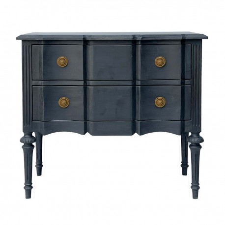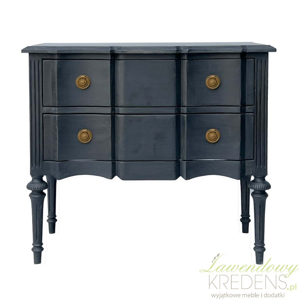 Komoda wyposażona jest w cztery praktyczne szuflady, które pozwalają na wygodne przechowywanie – od tekstyliów, przez dokumenty, aż po akcesoria codziennego użytku. Złote, okrągłe uchwyty dodają meblowi subtelnego blasku i kontrastują z ciemną powierzchnią, tworząc efekt elegancji w stylu paryskiego apartamentu. Delikatna falista linia dolnej krawędzi oraz żłobione, toczone nogi to ukłon w stronę stylu ludwikowskiego – pełnego finezji, ale i harmonii.