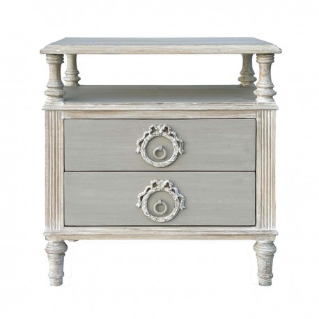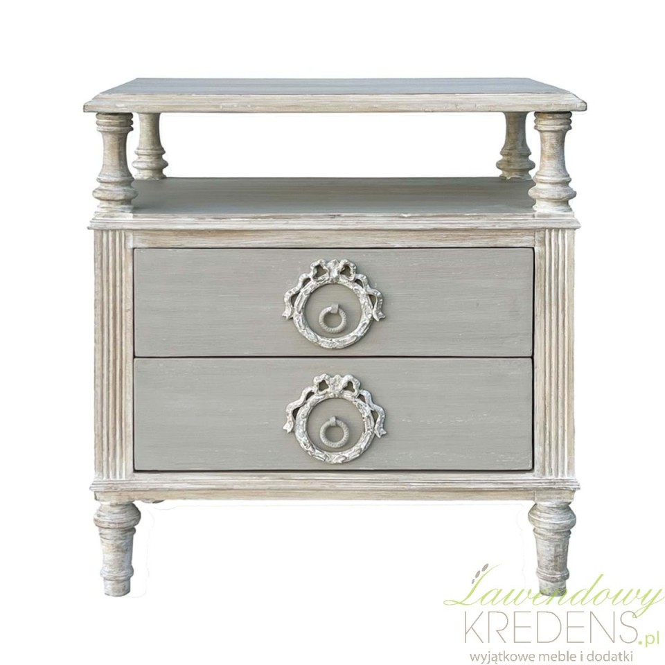Delikatnie toczone nogi i frezowane krawędzie to charakterystyczne elementy stylu ludwikowskiego, które w tym wydaniu zostały zinterpretowane w lekkiej, prowansalskiej estetyce. Dzięki temu mebel zachowuje dekoracyjny charakter, a zarazem nie przytłacza przestrzeni. Idealnie sprawdzi się w parze po obu stronach łóżka, ale również jako pojedynczy akcent przy fotelu, komodzie lub w przytulnym kąciku do czytania.