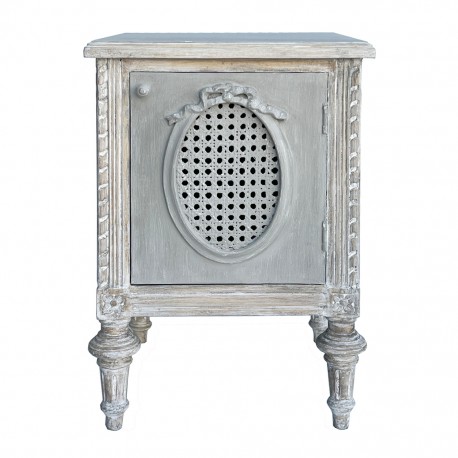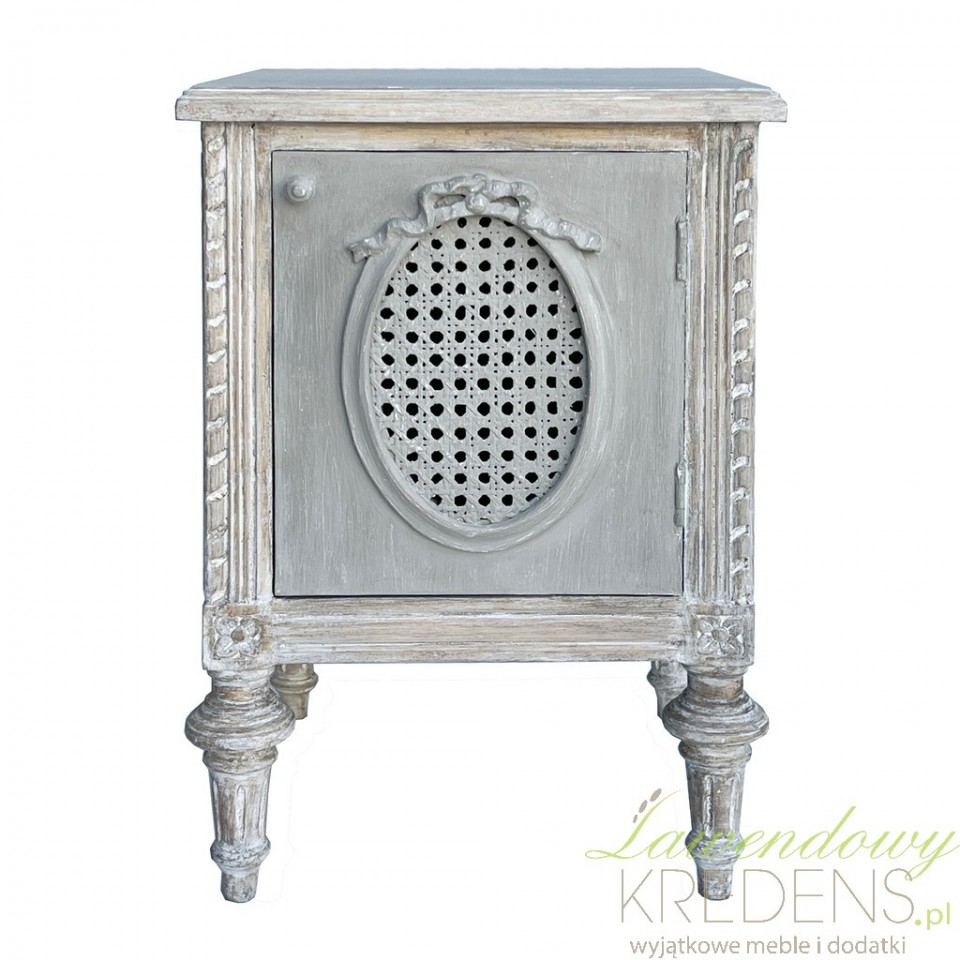 Ten uroczy mebel o wymiarach 60 × 40 × 40 cm wykonany został z trwałego drewna mango oraz płyty MDF, co zapewnia mu solidność i wytrzymałość na lata. Kolorystyka oscylująca wokół szaro-brązowych tonów została celowo postarzana, by uzyskać efekt vintage z wyraźnym wpływem francuskiej estetyki ludwikowskiej. Front drzwiczek zdobi elegancka dekoracja w formie owalnego medalionu z rattanowym wypełnieniem, który pełni również funkcję wentylacyjną. Wykończenie w stylu shabby chic wprowadza do wnętrza harmonię i subtelny szyk.