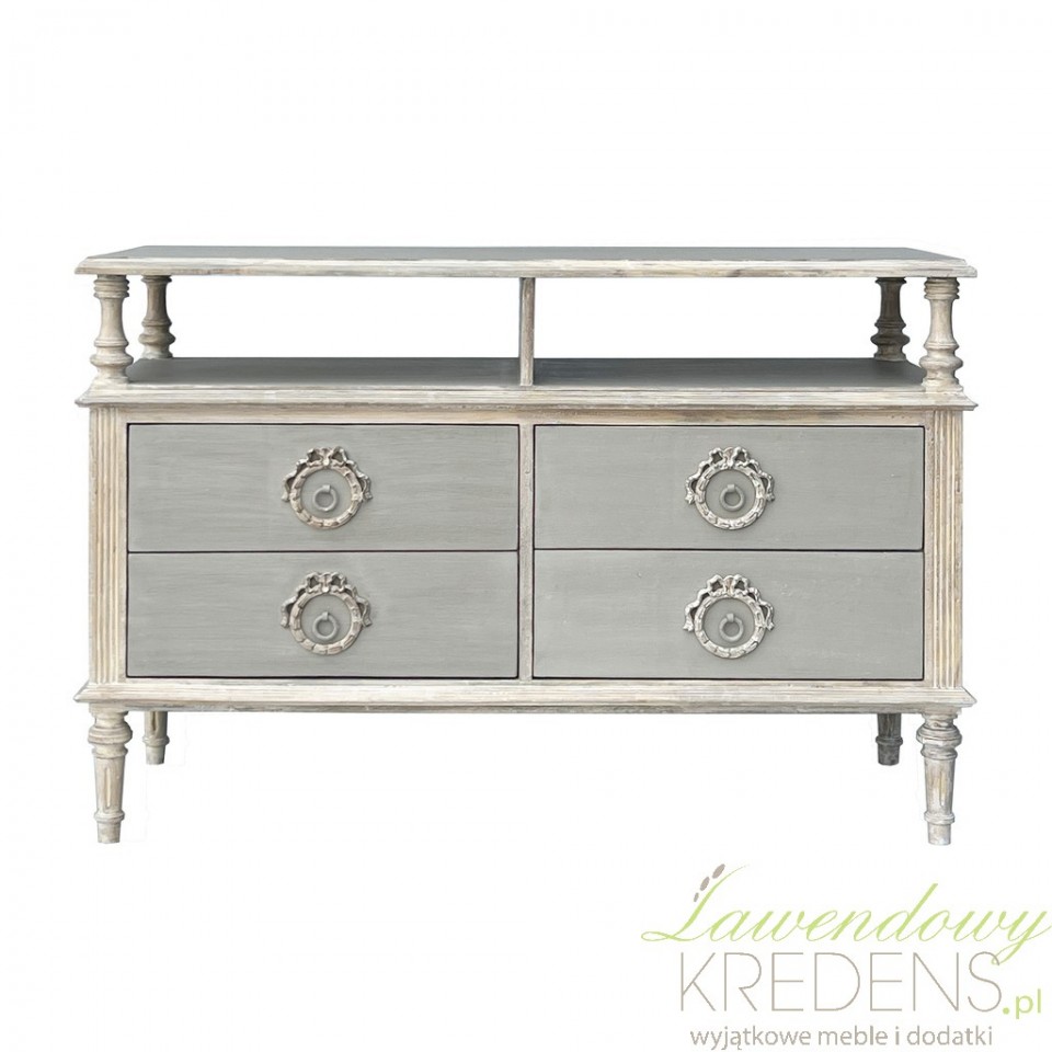 Każda szuflada została wykończona z wyjątkową starannością – delikatnie frezowane fronty, stylowe uchwyty w kształcie rozety oraz zaokrąglone krawędzie podkreślają wpływy stylu ludwikowskiego. Toczone nogi dodają lekkości, a lekko uniesiony korpus nadaje meblowi wrażenia przestrzenności. Wszystko to tworzy harmonijną całość, która sprawdzi się we wnętrzach inspirowanych Prowansją, francuskim szykiem czy klasyczną elegancją.