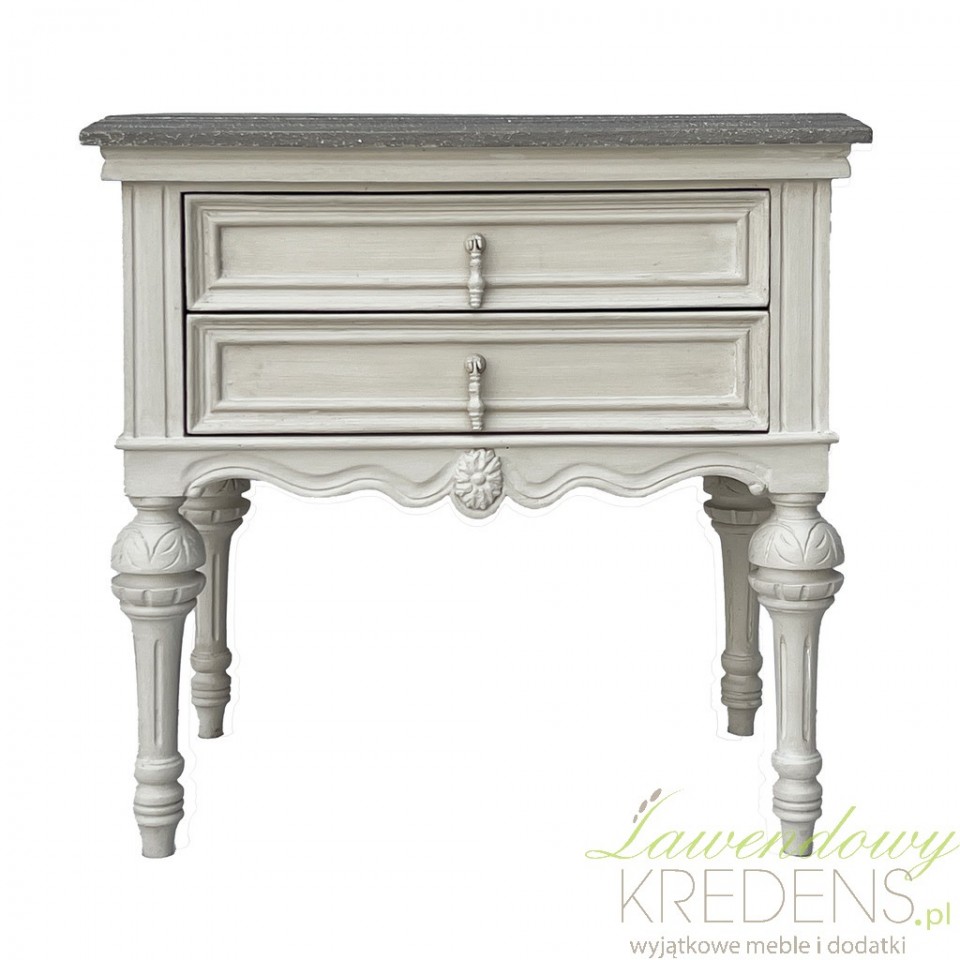 Delikatnie wygięte nóżki i dekoracyjne rzeźbienia na froncie oraz przy podstawie mebla przywołują na myśl pałacowe wnętrza z dawnych lat. Całość wieńczy elegancki blat, który pomieści lampkę nocną, książkę, budzik czy ceramiczną miseczkę na drobiazgi. Szafka wyposażona jest w dwie pojemne szuflady z eleganckimi uchwytami w formie stylizowanych rozet, które podkreślają jej vintage’owy charakter i dodają dekoracyjnego sznytu.