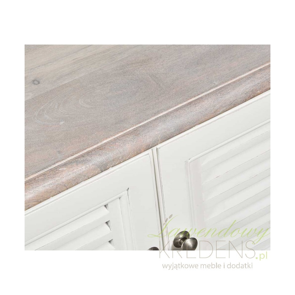 Korpus stolika wykonano z drewna akacjowego, które zapewnia trwałość i solidność. Ręczne malowanie podkreśla indywidualny charakter mebla – delikatne przetarcia i naturalne pęknięcia farby nie są wadą, lecz cechą świadczącą o autentyczności stylu vintage. Charakterystyczne drzwiczki żaluzjowe (shuttersy) przywołują klimat wnętrz nadmorskich willi w Hamptons.