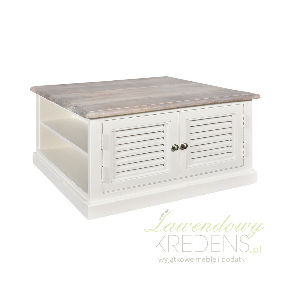 Stolik kawowy Belldeco Bristol White to kwadratowy mebel w kolorze antycznej bieli z blatem z drewna mango. Ręcznie malowany, z shuttersowymi drzwiczkami w stylu Hamptons.
