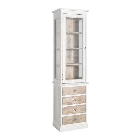 Niesamowita witryna Belldeco, dzięki połączeniu naturalności drewna z elementami pomalowanymi na biało, wyróżnia się na tle pozostałych mebli tego rodzaju. Dodatkowo jest bardzo pojemna, co zawdzięcza aż czterem półkom za przeszklonymi drzwiczkami oraz czterem szufladom ze stylowymi frontami z metalowymi uchwytami.