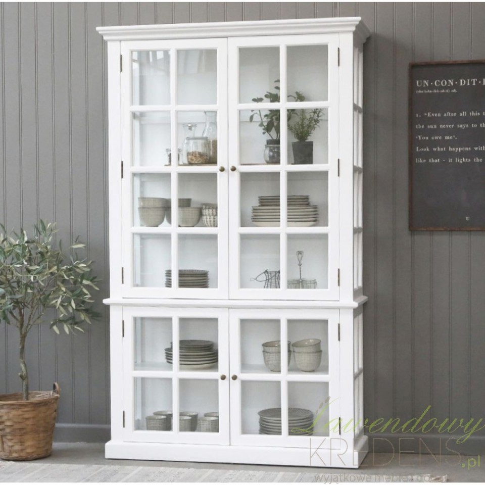 Biała witryna w stylu skandynawskim od duńskiej marki Chic Antique z przeszklonymi drzwiami i szprosami to elegancki mebel, który wprowadzi świeżość i lekkość do Twojego wnętrza.